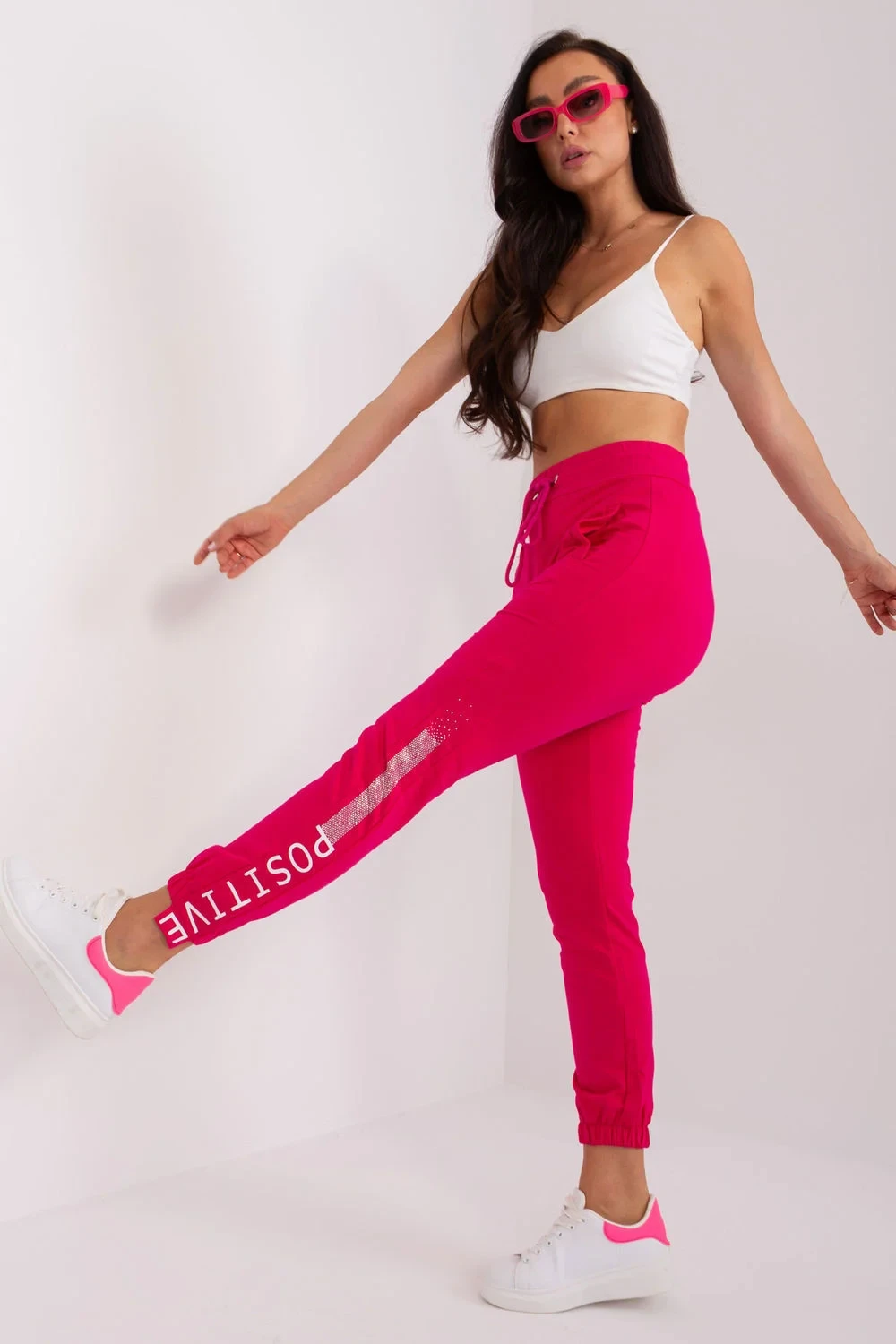 Dámské teplákové kalhoty v casual stylu jsou ideální volbou pro každodenní, pohodlné outfity. Vyrobené z měkké bavlny s přídavkem elastanu zajistí pohodlí a pružnost při nošení. Model s vysokým pasem, který krásně zdůrazní pas a zajistí lepší přizpůsobení. Kalhoty mají stahovací manžety na nohou a šňůrku v pase, co jim dodává sportovní charakter a umožňuje nastavení obvodu. Praktické boční kapsy zvyšují funkčnost. Hladká látka je ozdobena potiskem na nohavicích a jemnými třpytkami, které dodávají celku módní, neotřelý vzhled. Skvělé na procházky, nákupy nebo domácí relaxaci, must-have v každém casualovém šatníku.