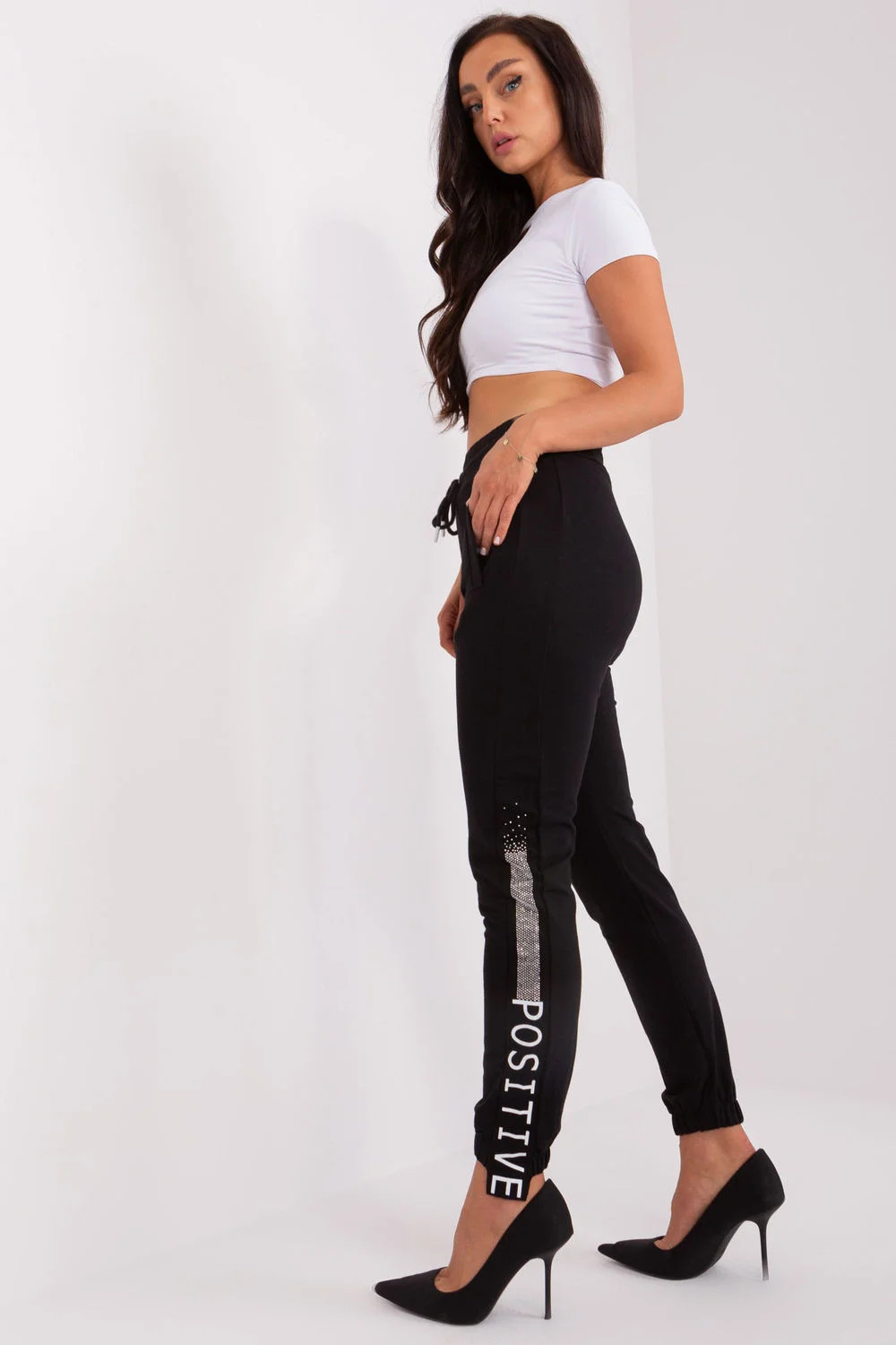 Dámské teplákové kalhoty v casual stylu jsou ideální volbou pro každodenní pohodlné outfit. Vyrobené z měkké bavlny s přídavkem elastanu poskytují pohodlí a pružnost během nošení. Model s vysokým pasem, který krásně zdůrazňuje pas a zajišťuje lepší přizpůsobení. Kalhoty mají stahovací proužky na nohavicích a šňůrku v pase, co jim dodává sportovní charakter a umožňuje regulaci obvodu. Praktické boční kapsy zvyšují funkčnost. Hladká tkanina je zdobená potiskem na nohavicích a jemnými džetkami, které dodávají celku módní, neokoukaný vzhled. Skvělé na procházky, nákupy nebo domácí relaxaci, must-have v každém casualovém šatníku.