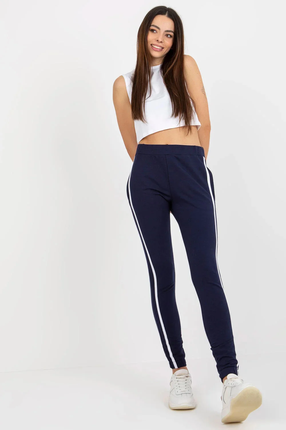 Pohodlné tepláky v casual sportovním stylu jsou ideální volbou na každý den a fyzickou aktivitu. Vyrobené z měkké a elastické směsi bavlny, polyesteru a elastanu zaručují pohodlí a volnost pohybu. Model s vysokým pasem s elastickým pásem se skvěle přizpůsobí postavě. Hladký materiál s kontrastními pruhy po stranách dodává celku moderní, sportovní charakter. Praktické kapsy na bocích umožňují uložení drobností, a nohavice s pružnými manžetami zajišťují pohodlné přizpůsobení. Tepláky bez zapínání - snadno se oblékají a jsou ideální na každý den.