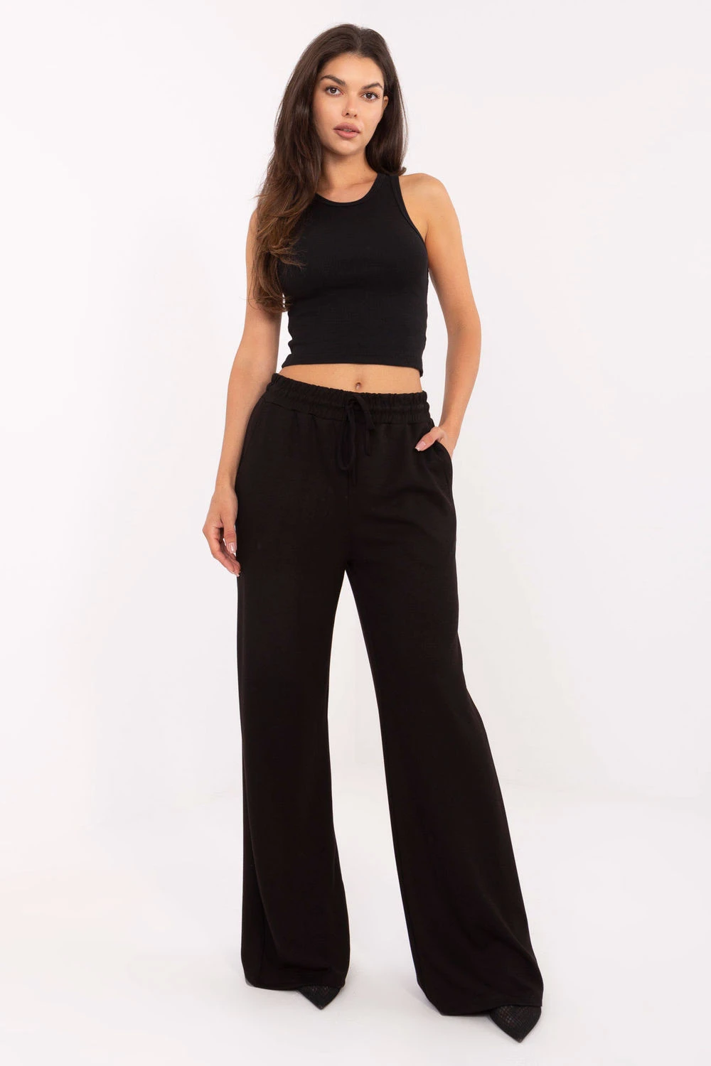Kalhoty ve sportovním stylu casual, ideální na každý den. Vyrobené z měkké směsi viskózy, polyesteru a elastanu, poskytují pohodlí, prodyšnost a lehkou pružnost materiálu. Hladká struktura látky jim dodává univerzální charakter, díky čemuž se snadno sladí s mnoha styly. Model se vyznačuje vysokým pasem a širokými nohavicemi, které se krásně usazují v pohybu, zdůrazňující volný střih. V pase je praktická šňůrka pro přizpůsobení postavě a boční kapsy s všitím dodávají funkčnosti. Moderní a pohodlné, skvělá volba pro každodenní, casualové outfit.