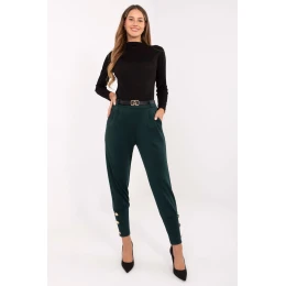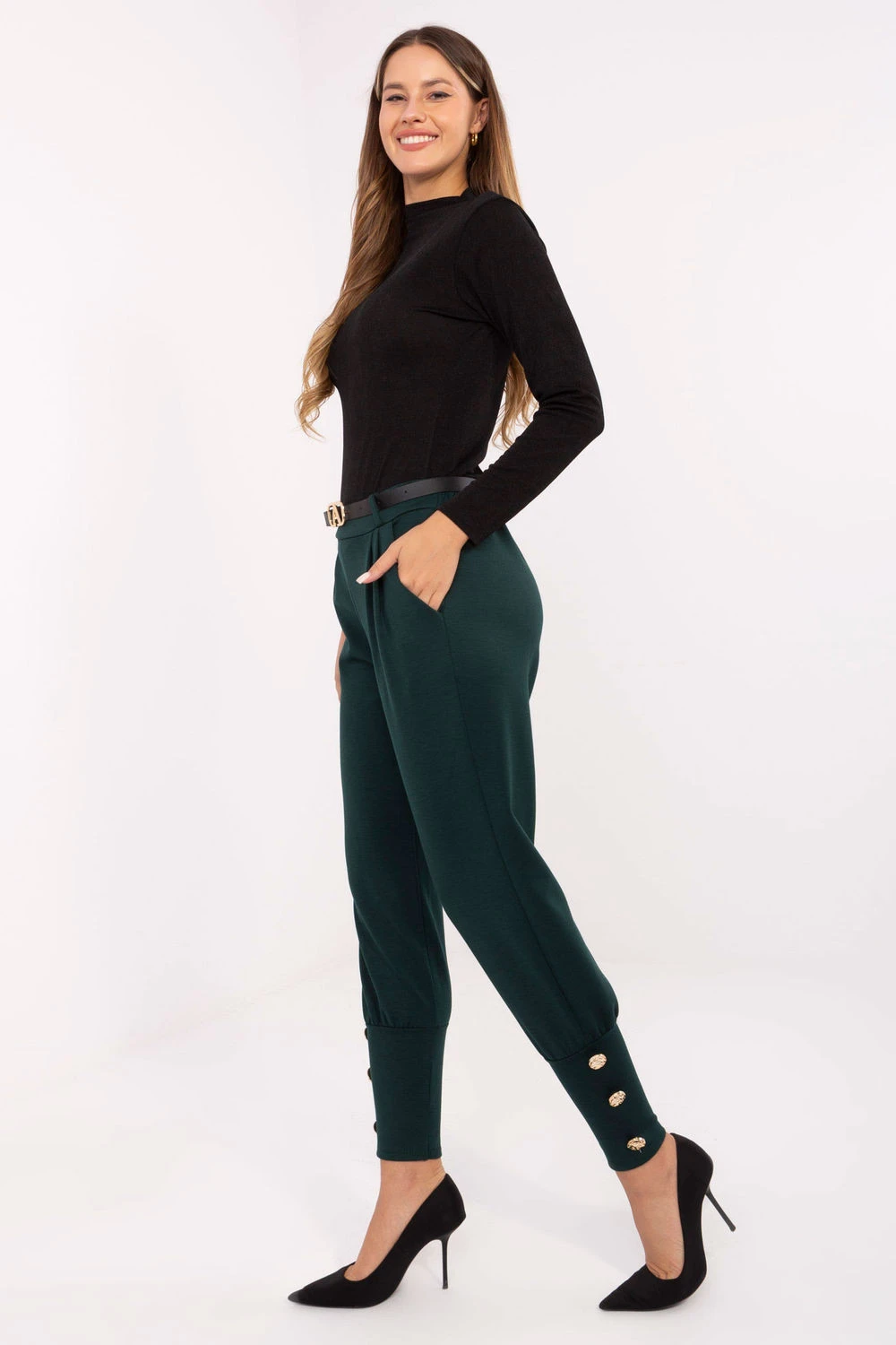 Moderní a pohodlné dámské teplákové kalhoty v casual stylu, ideální na každý den a do práce v uvolněném provedení. Vyrobené z příjemné směsi viskózy a polyesteru, zaručují pohodlí nošení a elegantní, propracovaný vzhled. Model s vysokým pasem a zužujícími se nohavicemi skvěle zdůrazňuje postavu a zároveň poskytuje volnost pohybu. V pasu vzadu je vsazena elastická guma, díky čemuž se kalhoty dokonale přizpůsobují postavě. Pro větší funkčnost jsou vybaveny bočními kapsami, a zapínacím páskem umožňují decentně zdůraznit pas. Na spodku nohavic jsou široké manžety s ozdobnými knoflíky, které přidávají celku stylový charakter. To je skvělá volba pro ženy, které oceňují spojení pohodlí a městské elegance, ideální do práce, na procházku nebo setkání s přáteli.