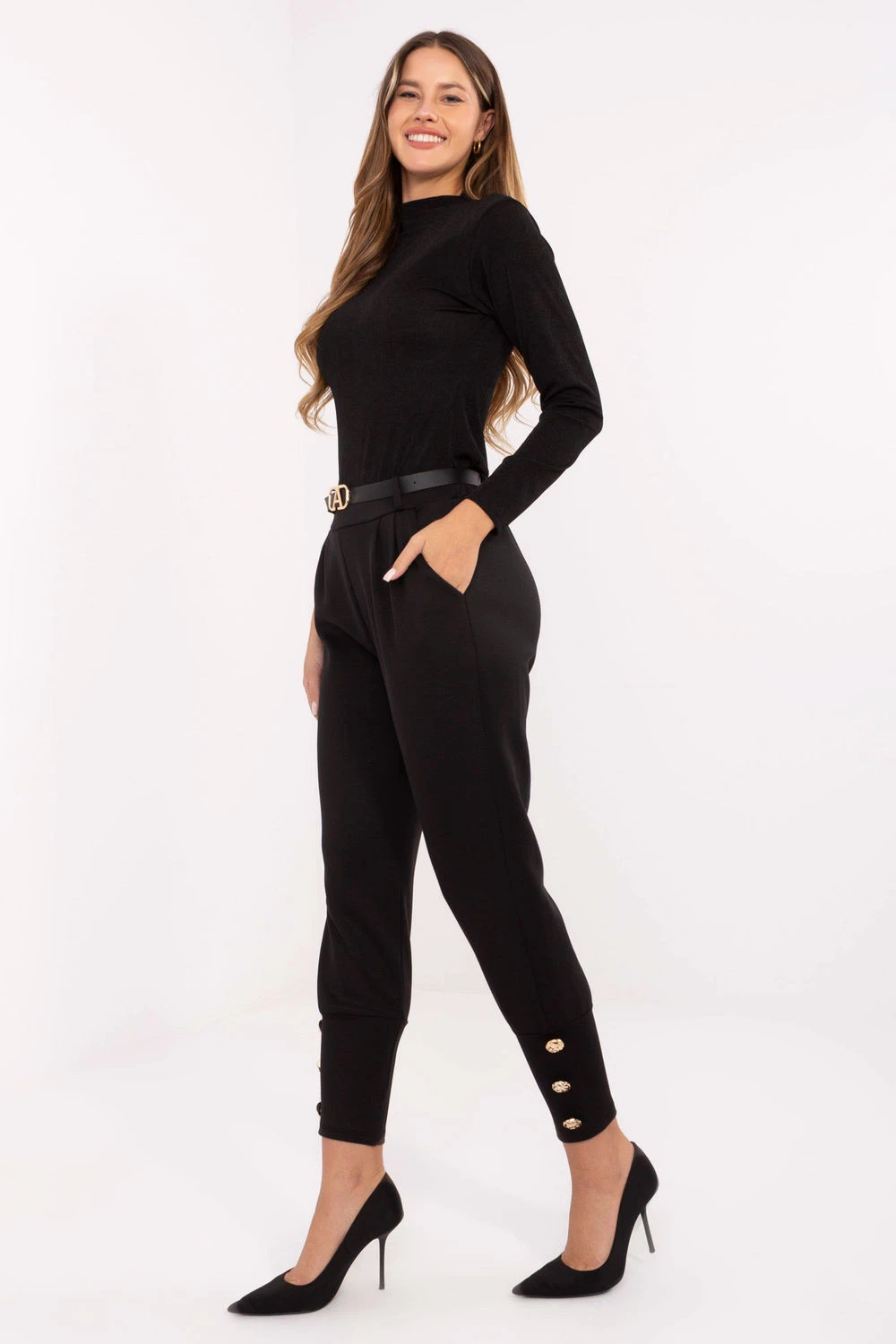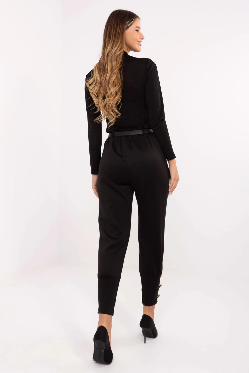 Moderní a pohodlné dámské teplákové kalhoty v casual stylu, ideální na každodenní nošení i do práce v uvolněném provedení. Vyrobené z příjemné směsi viskózy a polyesteru, zaručují pohodlí nošení a elegantní, propracovaný vzhled. Model s vysokým pasem a se zužujícími se nohavicemi skvěle zdůrazňuje postavu a zároveň poskytuje volnost pohybu. V pasu je na zadní straně vsazena elastická guma, díky čemuž kalhoty dokonale sedí na postavě. Pro větší funkčnost jsou vybaveny bočními vloženými kapsami a zapínacím páskem, který jemně zdůrazňuje pas. Na spodním okraji nohavic jsou široké manžety s ozdobnými knoflíky, které dodávají celku stylový charakter. Jedná se o skvělou volbu pro ženy, které ocení kombinaci pohodlí a městské elegance, ideální do práce, na procházku nebo setkání s přáteli.