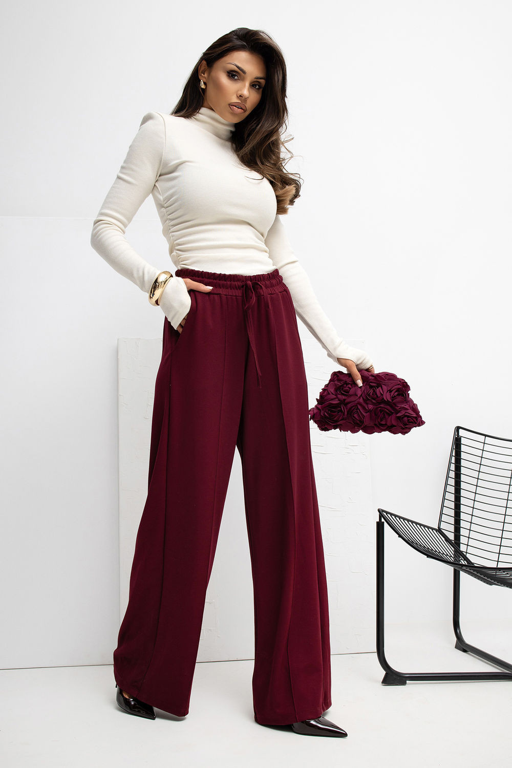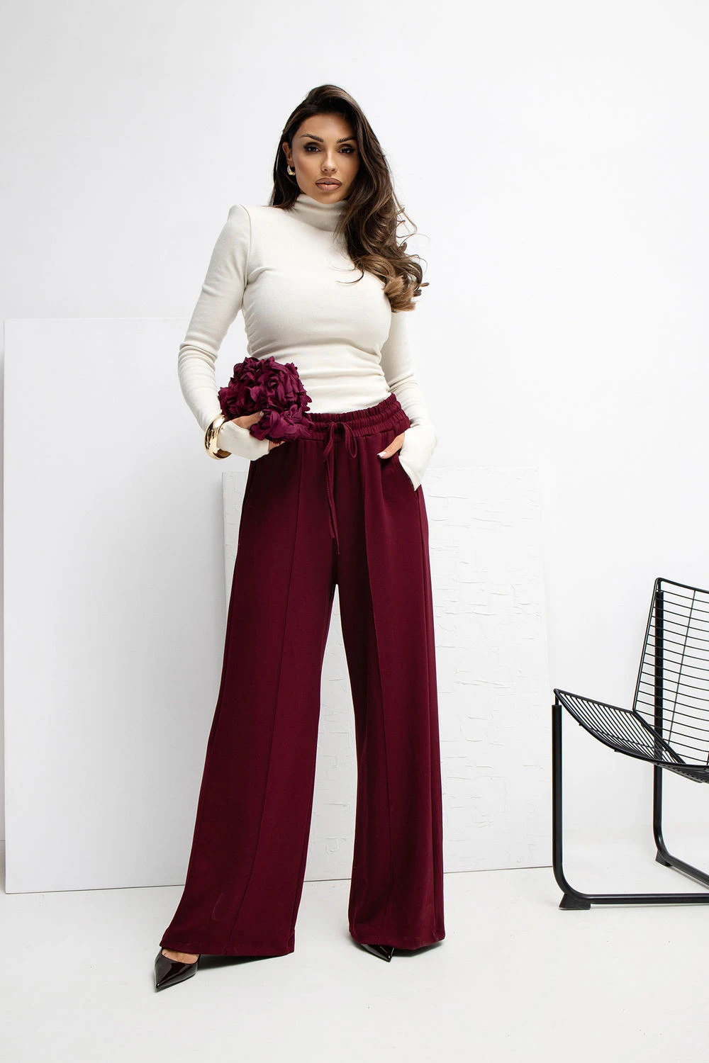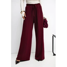 Měkké džínové kalhoty typu palazzo vyrobené z materiálu velmi jemného, elastického a velmi příjemného na dotek. Díky vysokému pasu a širokým nohavicím se model krásně tvaruje na postavě, zároveň poskytující maximální pohodlí při nošení. Na přední straně jsou decentní ozdobné švy, které dodávají kalhotám elegantní charakter a opticky prodlužují nohy. V pase je pohodlné šněrování, umožňující ideální přizpůsobení postavě, a boční kapsy zvýrazňují ležérní styl a funkčnost modelu. Hladký materiál s příměsí elastanu a převahou viskózy činí kalhoty prodyšné, elastické a skvěle se hodí do každodenních outfitů, jak do práce, tak do běžného života. Ideální volba pro ty, kteří ocení pohodlí spojené s moderním, minimalistickým stylem.