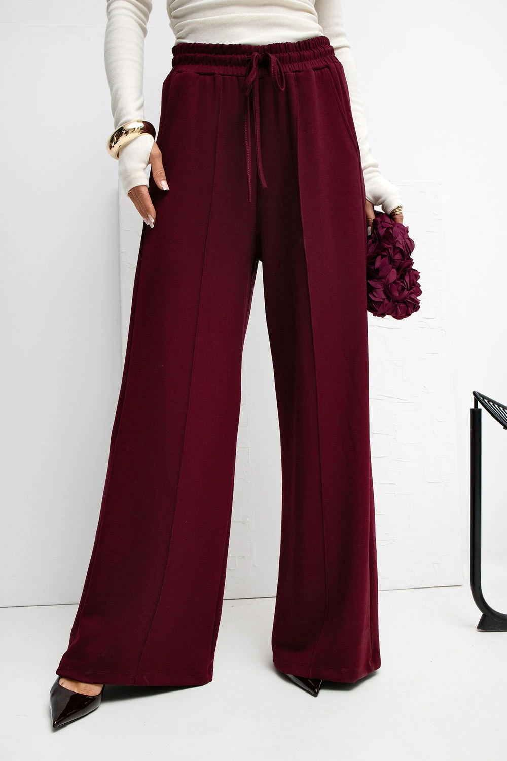 Měkké džínové kalhoty typu palazzo vyrobené z materiálu velmi jemného, elastického a velmi příjemného na dotek. Díky vysokému pasu a širokým nohavicím se model krásně tvaruje na postavě, zároveň poskytující maximální pohodlí při nošení. Na přední straně jsou decentní ozdobné švy, které dodávají kalhotám elegantní charakter a opticky prodlužují nohy. V pase je pohodlné šněrování, umožňující ideální přizpůsobení postavě, a boční kapsy zvýrazňují ležérní styl a funkčnost modelu. Hladký materiál s příměsí elastanu a převahou viskózy činí kalhoty prodyšné, elastické a skvěle se hodí do každodenních outfitů, jak do práce, tak do běžného života. Ideální volba pro ty, kteří ocení pohodlí spojené s moderním, minimalistickým stylem. Elastan 50 %