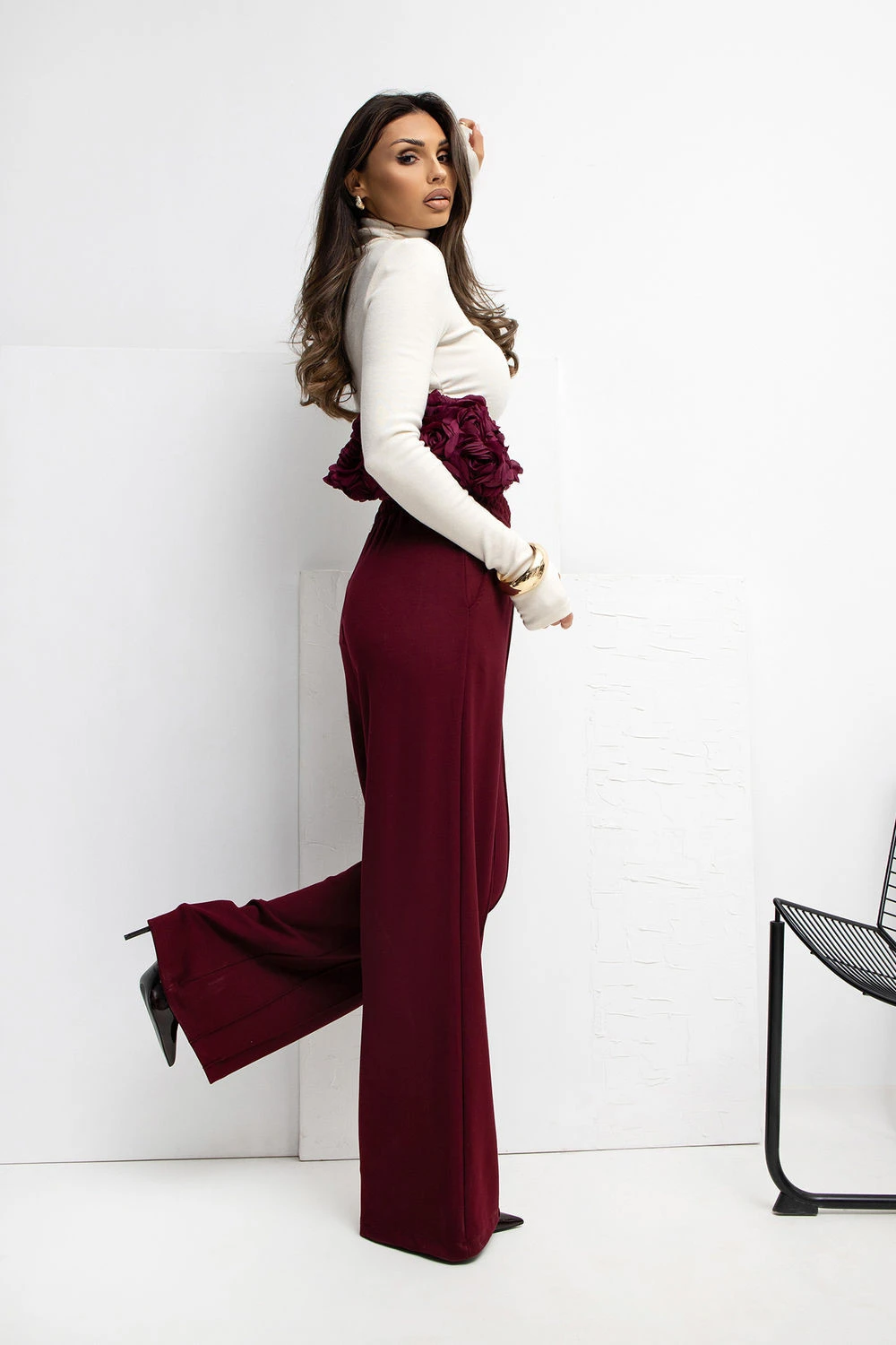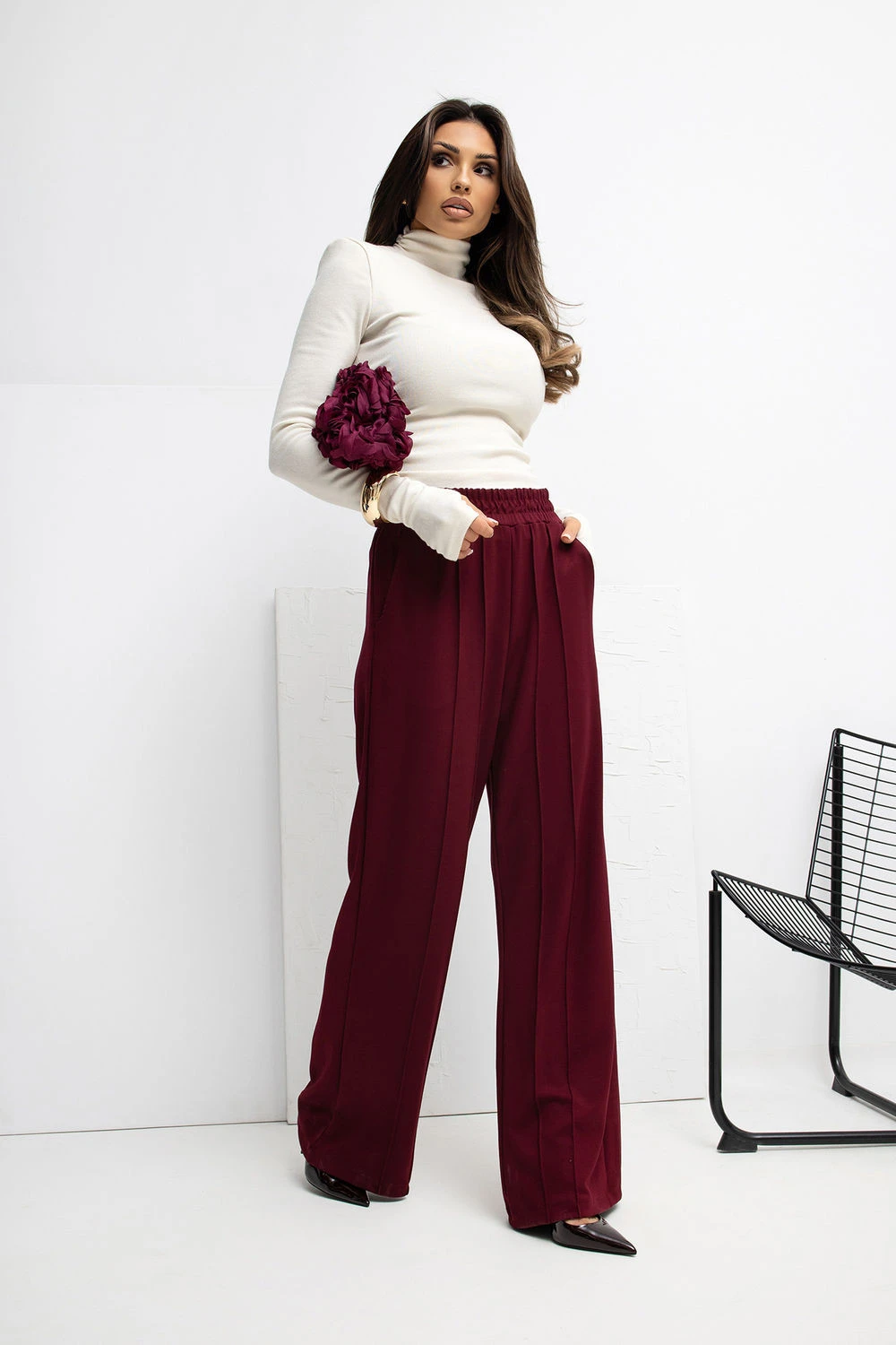 Mimořádně pohodlné teplákové kalhoty vyrobené z materiálu typu "máslo", velmi měkkého, jemného a mimořádně příjemného na dotek. Díky směsi viskózy a elastanu jsou kalhoty elastické, lehké a ideálně se přizpůsobují postavě, poskytují maximální pohodlí každý den. Model s širokými nohavicemi wide leg vyniká širokými nohavicemi, které zaručují volnost pohybu a moderní vzhled. Vysoký pas s gumou v pasu zajišťuje ideální přizpůsobení a pohodlí nošení, a absenci zapínání zajišťuje, že kalhoty lze snadno a rychle obléknout. Dominantní hladký vzor jim dodává minimalistický charakter, a boční, zasouvací kapsy přidávají funkcionalitu bez narušení jednoduché linie střihu. Ideální pro ženy, které oceňují pohodlí, měkkost a moderní, volný styl.