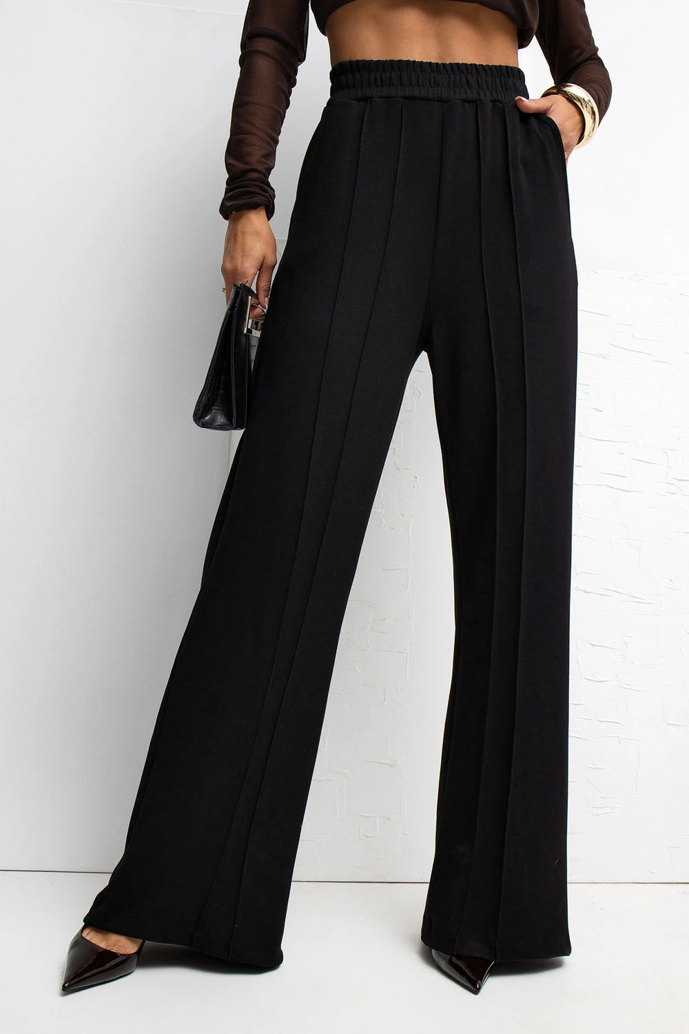 Velmi pohodlné tepláky vyrobené z materiálu typu měkká tkanina, velmi měkké, jemné a mimořádně příjemné na dotek. Díky směsi viskózy a elastanu jsou kalhoty elastické, lehké a ideálně se přizpůsobují postavě, poskytují maximální pohodlí každý den. Model s širokými nohavicemi typu wide leg je ohromující svou volností pohybu a moderním vzhledem. Vysoký pas s gumou zaručuje ideální přizpůsobení a pohodlí nošení, a absenci zapínání díky čemuž se kalhoty snadno a rychle oblékají. Dominující hladký vzor dodává minimalistický charakter a boční vložené kapsy přidávají funkčnost bez narušení jednoduché linie střihu. Ideální pro ženy, které oceňují pohodlí, měkkost a moderní, volný styl.