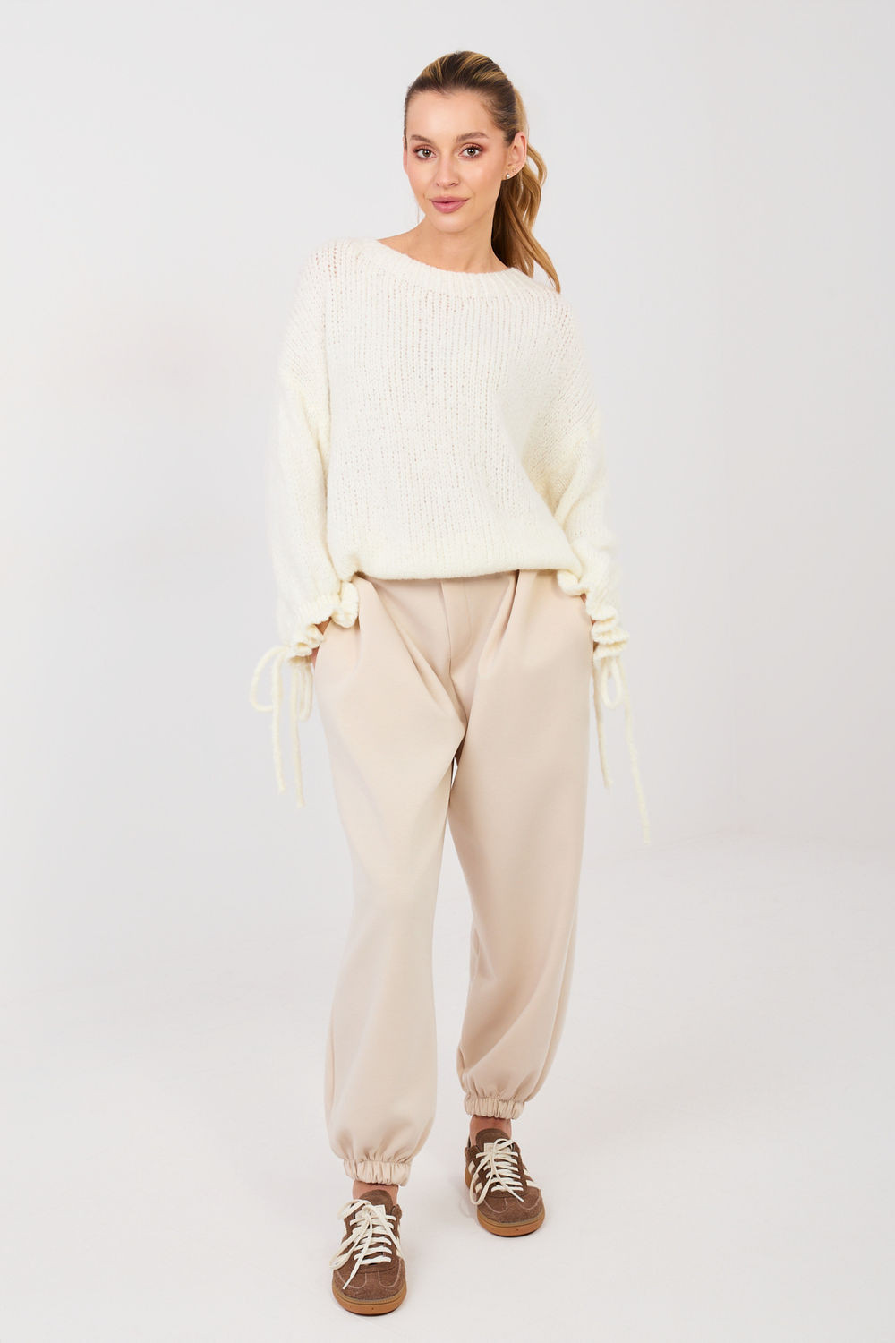 Volné teplákové kalhoty typu jogger jsou kombinací pohodlí a stylového vzhledu, ideální na každý den a do pracovního prostředí s volnějším stylem. Vyrobené z měkké a elastické směsi viskózy s přídavkem elastanu, zajistí pohodlí nošení a volnost pohybů. Model s hladkým vzorem a ozdobnými záhyby vpředu, které kalhotám dodávají elegantní charakter. Elastický pas na zádech zajišťuje dobrou úpravu ke střihu. Nohavice se zakončením na elastických manžetách zdůrazňují střih joggerů a zajišťují pohodlí při nošení. Kalhoty nemají zapínání, boční kapsy zvyšují jejich funkčnost. Celkový vzhled doplňuje ozdobný knoflík, který je stylovým detail. Ideální pro každodenní stylizace s mikinou, svetrem nebo košilí.