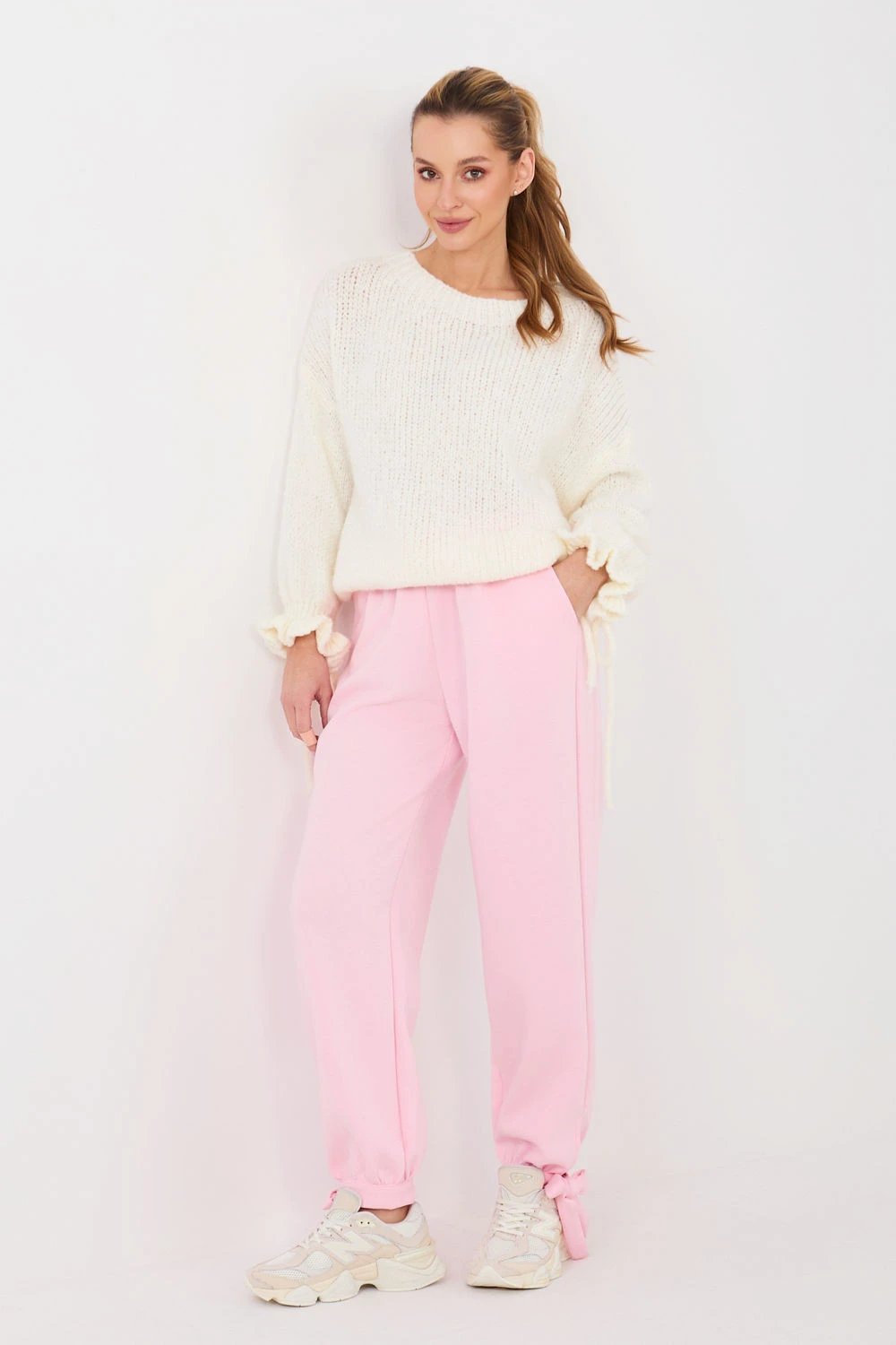 Volnočasové tepláky typu jogger jsou ideální nabídkou na každý den, spojující pohodlí s módním vzhledem. Vyrobené z měkké a elastické směsi viskózy, bavlny a elastanu, poskytují pohodlí při nošení a volnost pohybu. Model s hladkým vzorem a vysokým pasem se krásně přizpůsobuje postavě, a šňůrka v pase umožňuje individuální nastavení. Nohavice s manžetami a dodatečnou šňůrkou dole zdůrazňují sportovní charakter kalhot a umožňují nastavení šířky. Praktické boční kapsy zvyšují funkcionalitu modelu. Ideální k dennímu oblíkání s mikinou, tričkem nebo svetrem.