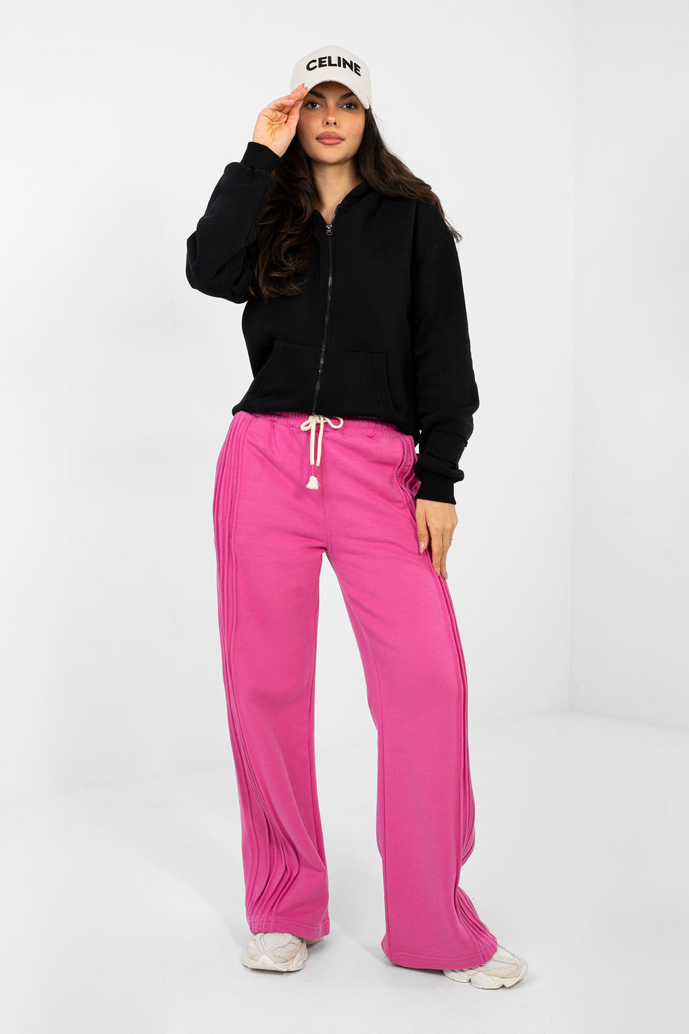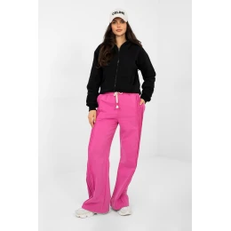 Dámské volné kalhoty jsou kombinací pohodlí a módního, ležérního stylu. Vyrobené z vysoce kvalitní bavlny s přídavkem polyesteru zajistí pohodlí, odolnost a příjemný pocit měkkosti po celý den. Model je charakterizován širokými nohavicemi, které se volně skládají podél postavy a dodávají celku moderní charakter. Dekorativní prošívání po stranách nohavic podél celé délky jemně zdůrazňuje linii nohou a přidává kalhotám originální akcent. Vysoký pas krásně zdůrazňuje pas, a šňůrka v pasu ve spojení s vsazenou gumou zajistí ideální přizpůsobení a pohodlí nošení. Praktické boční kapsy zvyšují funkčnost a dělají z kalhot skvělý kousek do každodenních stylizací. Hladký vzor a univerzální střih je činí skvělou základnou pro mnoho outfitů jak s mikinou, tak s přiléhavým topem.