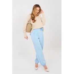 Elegantní teplákové kalhoty typu joggery jsou kombinací pohodlí a stylového provedení. Model s dlouhými nohavicemi ukončenými manžetami se skvěle přizpůsobuje postavě, dodává celku moderní charakter. Hladký vzor zdůrazňuje jejich univerzálnost a dělá je skvělými jak pro každodenní, tak pro více propracované stylizace. V pase je vsazena elastická guma, která zajistí pohodlné padnutí a pohodlí při nošení po celý den. Boční kapsy zvyšují funkčnost a jemná brož v podobě květinky dodává eleganci a ženský akcent. Kalhoty jsou vyrobeny z velmi příjemného materiálu typu "masełko" z měkké a jemné směsi polyesteru, viskózy a elastanu. Tkanina krásně padne na tělo, poskytuje volnost pohybu a vysoký komfort při nošení. Ideální volba pro ženy, které oceňují pohodlí v elegantním provedení.