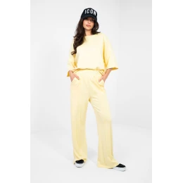 Velmi pohodlné teplákové kalhoty vyrobené z materiálu typu "máslo", který je velmi měkký, jemný a nesmírně příjemný na dotek. Díky směsi viskózy a elastanu jsou kalhoty elastické, lehké a ideálně se přizpůsobují postavě, poskytují maximální pohodlí každý den. Střih wide leg s širokými nohavicemi je okouzlující, nabízí volnost pohybu a moderní vzhled. Vysoký pas s gumou v pase zajišťuje ideální přizpůsobení a pohodlí při nošení, a absence zapínání zaručuje snadné a rychlé oblékání. Hladký design dodává kalhotám minimalistický charakter, a boční kapsy přidávají funkčnost bez narušení jednoduché linie střihu. Ideální pro ženy, které ocení pohodlí, měkkost a moderní, volný styl.