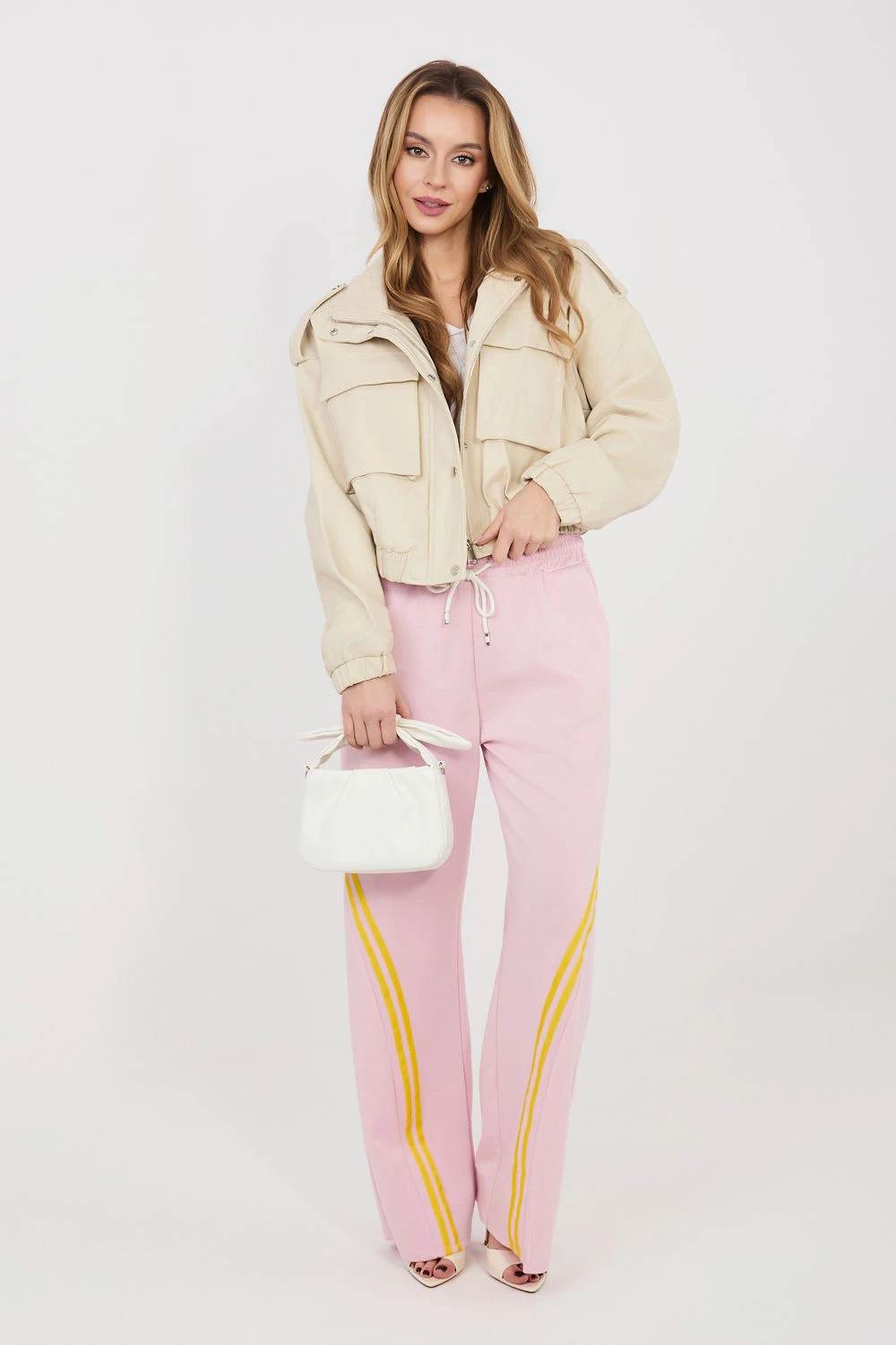 Dámské teplákové kalhoty jsou pohodlnou a stylovou volbou na každý den, ideální pro ženy, které ocení pohodlí a módní, ležérní vzhled. Skvěle se hodí během každodenních aktivit, procházek, nákupů nebo relaxace doma. Model je vyroben z příjemné směsi materiálů: polyesteru, viskózy a elastanu. Díky tomu jsou kalhoty měkké, elastické a dobře se přizpůsobují postavě, poskytují plnou volnost pohybu. Kalhoty mají vysoký pas, který zajišťuje pohodlí nošení a hezky zdůrazňuje pas. V pasu je praktický šňůrkový uzávěr, umožňující individuální přizpůsobení postavě. Na bocích jsou umístěny funkční kapsy, ideální na drobné předměty. Hladký materiál dává kalhotám univerzální charakter, zatímco módním akcentem jsou šikmé pruhy umístěné na přední straně nohavic, které dodávají celku moderní a sportovně elegantní styl. To je skvělá volba pro ženy, které chtějí spojit pohodlí tepláků s módním každodenním vzhledem.