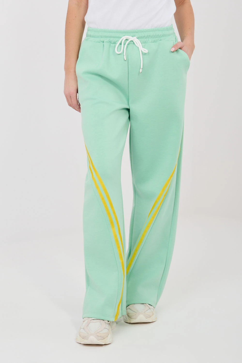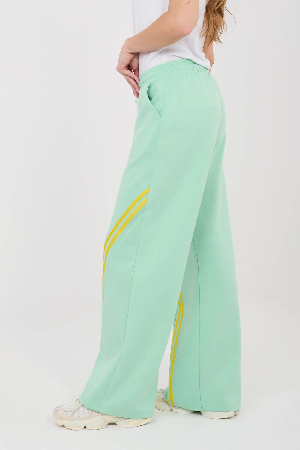 Dámské teplákové kalhoty jsou pohodlnou a stylovou volbou na každý den, ideální pro ženy, které ocení pohodlí a módní, ležérní vzhled. Skvěle se hodí během každodenních aktivit, procházek, nákupů nebo relaxace doma. Model je vyroben z příjemné směsi materiálů: polyesteru, viskózy a elastanu. Díky tomu jsou kalhoty měkké, elastické a dobře se přizpůsobují postavě, poskytují plnou volnost pohybu. Kalhoty mají vysoký pas, který zajišťuje pohodlí při nošení a hezky zdůrazňuje pas. V páse je praktické šňůrkování, umožňující individuální přizpůsobení postavě. Na bocích jsou umístěny funkční kapsy na zip, ideální na drobné předměty. Hladký materiál dává kalhotám univerzální charakter, zatímco módním akcentem jsou šikmé pruhy umístěné na přední straně nohavic, které dodávají celku moderní a sportovně elegantní styl. Skvělá volba pro ženy, které chtějí spojit pohodlí tepláků s módním každodenním vzhledem.