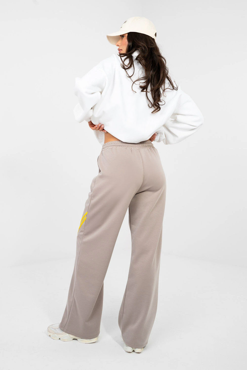 Dámské teplákové kalhoty jsou pohodlnou a stylovou volbou na každý den, ideální pro ženy, které ocení pohodlí a módní, ležérní vzhled. Skvěle se hodí na každodenní aktivity, procházky, nákupy nebo relaxaci doma. Model je vyroben z příjemné směsi materiálů: polyesteru, viskózy a elastanu. Díky tomu jsou kalhoty měkké, elastické a dobře se přizpůsobují postavě, poskytují plnou volnost pohybu. Kalhoty mají vysoký pas, který zajišťuje pohodlí nošení a hezky zdůrazňuje pas. V pasu je praktické šňůrkování, umožňující individuální přizpůsobení postavě. Po stranách jsou umístěny funkční kapsy na zip, ideální pro drobné předměty. Hladký materiál dodává kalhotám univerzální charakter, zatímco módním akcentem jsou šikmé pruhy umístěné na přední straně nohavic, které celku dodávají moderní a sportovně elegantní styl. To je skvělá volba pro ženy, které chtějí spojit pohodlí tepláků s módním každodenním vzhledem.