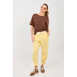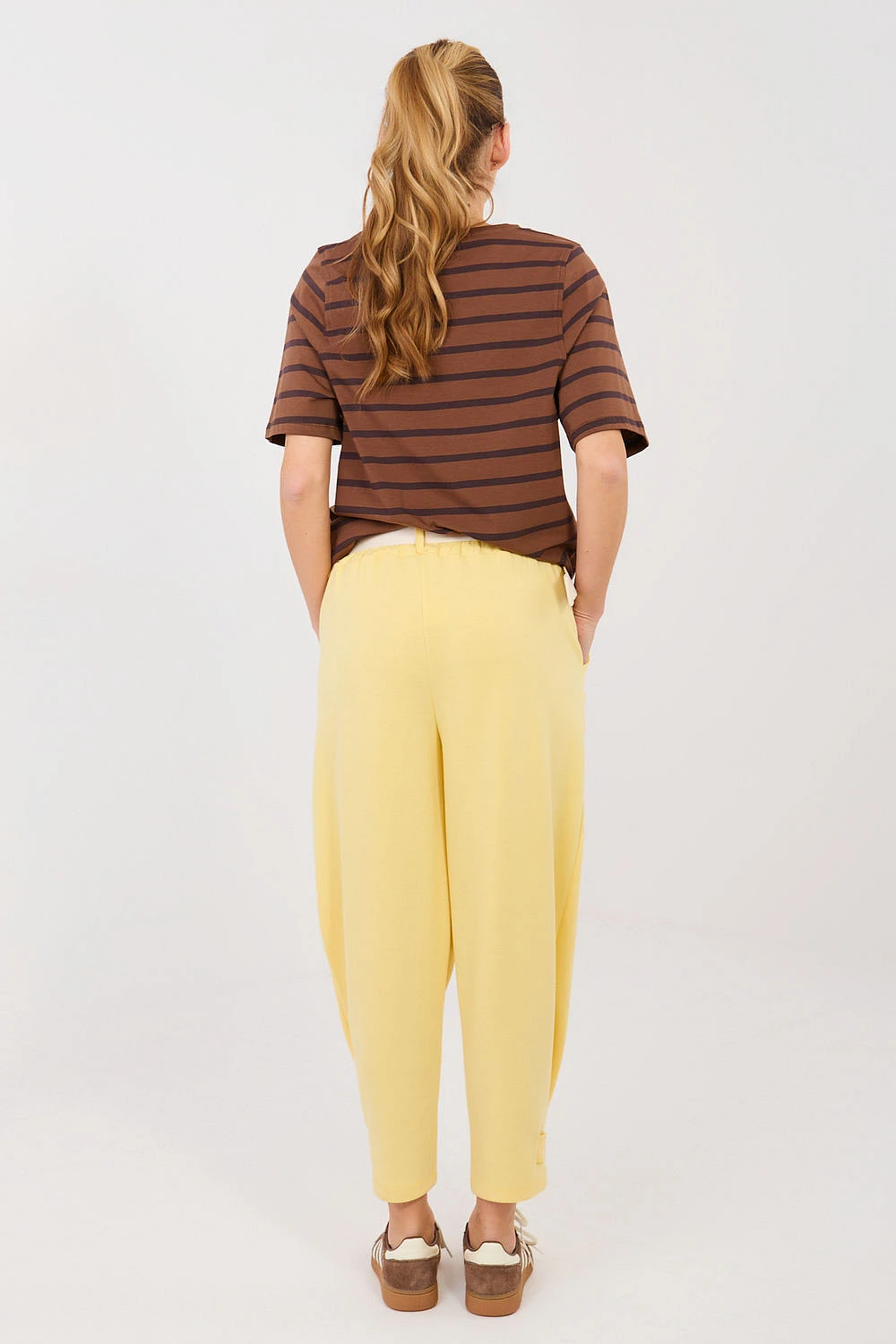 Kalhoty dámské ve stylu casual, navržené s ohledem na pohodlí při každodenním nošení. Model s hladkým vzorem se skvěle hodí do volných stylizací, ať už na procházku, nákupy nebo domácí relaxaci. Kalhoty jsou vyrobeny z velmi příjemného materiálu typu "máslo". Jedná se o měkkou, jemnou a elastickou látku složenou z viskózy, elastanu a bavlny, která poskytuje vysoký komfort nošení a skvěle se přizpůsobuje postavě. Model má vysoký pas a elastický pásek, který zaručuje pohodlné přizpůsobení. Navíc v pasu je zapínací pás, který je praktickým a stylovým doplňkem. Kalhoty mají boční kapsy. Nohavice se zužujícím se střihem ve délce 7/8 zdůrazňují postavu. U spodní části nohavic jsou zapínací pásky umožňující nastavení obvodu nohy a přizpůsobení podle vlastních preferencí. Model bez klasického zapínání je snadný a pohodlný na oblékání.