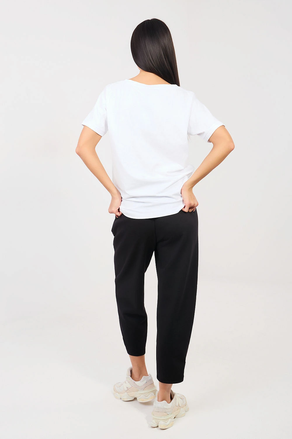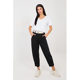 Kalhoty dámské ve stylu casual, navržené s ohledem na pohodlí při každodenním nošení. Model s hladkým vzorem se skvěle hodí do volných stylizací, ať už na procházku, nákupy nebo domácí relaxaci. Kalhoty jsou vyrobeny z velmi příjemného materiálu typu "máslo". Jedná se o měkkou, jemnou a elastickou látku složenou z viskózy, elastanu a bavlny, která poskytuje vysoký komfort nošení a perfektně se přizpůsobuje postavě. Model má vysoký pas a elastický pásek v pase, což zaručuje pohodlné přizpůsobení. Kromě toho je v pase zapínací pásek, který představuje praktický a stylový doplněk. Kalhoty mají boční kapsy. Nohavice s délkou 7/8 mají zužující se střih, který zdůrazňuje postavu. Na spodním okraji nohavic jsou pásky s knoflíky, umožňující regulaci obvodu nohavice a přizpůsobení podle vlastních preferencí. Model bez klasického zapínání je snadný a pohodlný k nasazení.