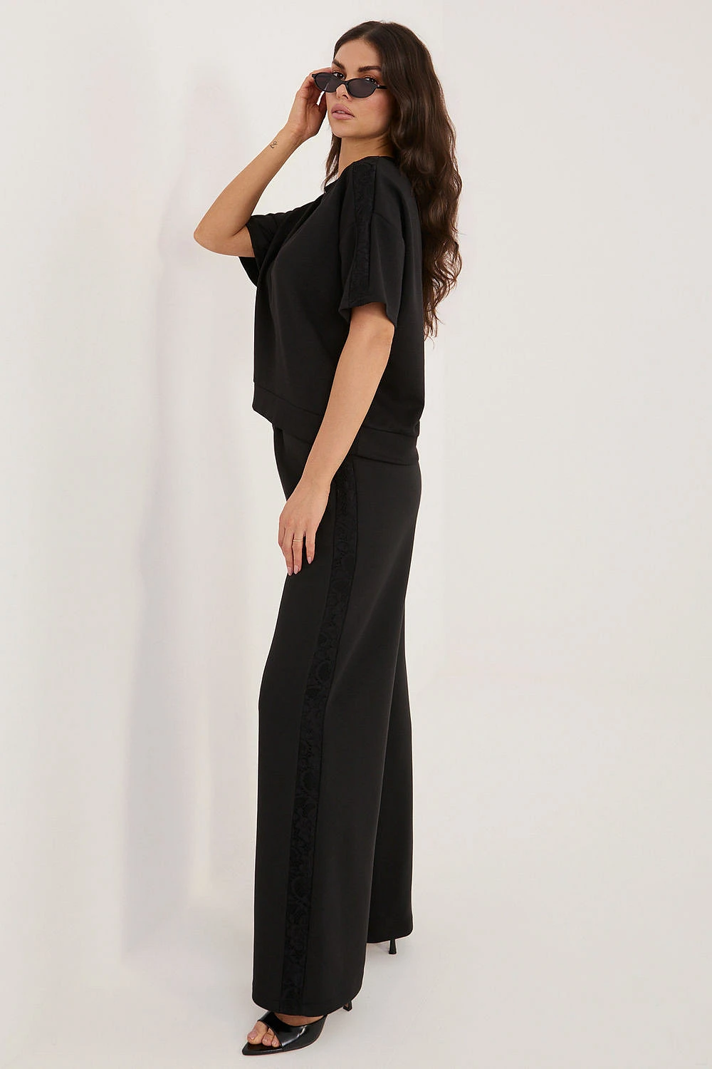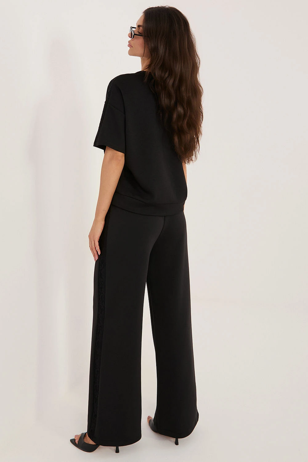 Kalhoty ve stylu wide leg jsou skvělou kombinací pohodlí a moderního stylu. Navrženy s ohledem na každodenní použití, skvěle se hodí jak do každodenního nošení, tak i do více ležérního outfitu do práce. Model s dlouhými, širokými nohavicemi poskytuje volnost pohybu a trendy, uvolněný vzhled. Vysoký pas zdůrazňuje pas a šňůrka v pase umožňuje perfektní přizpůsobení postavě. Hladký vzor dělá kalhoty univerzální a snadné na stylování. Vyrobené z příjemné směsi polyesteru, viskózy a elastanu, zaručují pohodlí nošení a trvanlivost. Další výhodou jsou decentní pruhy z krajky, které dodávají celku ženský a elegantní charakter. Praktické, boční kapsy zvyšují funkčnost modelu, dělají je ideální volbou na různé příležitosti, od procházek po městě po den v kanceláři v méně formálním stylu.