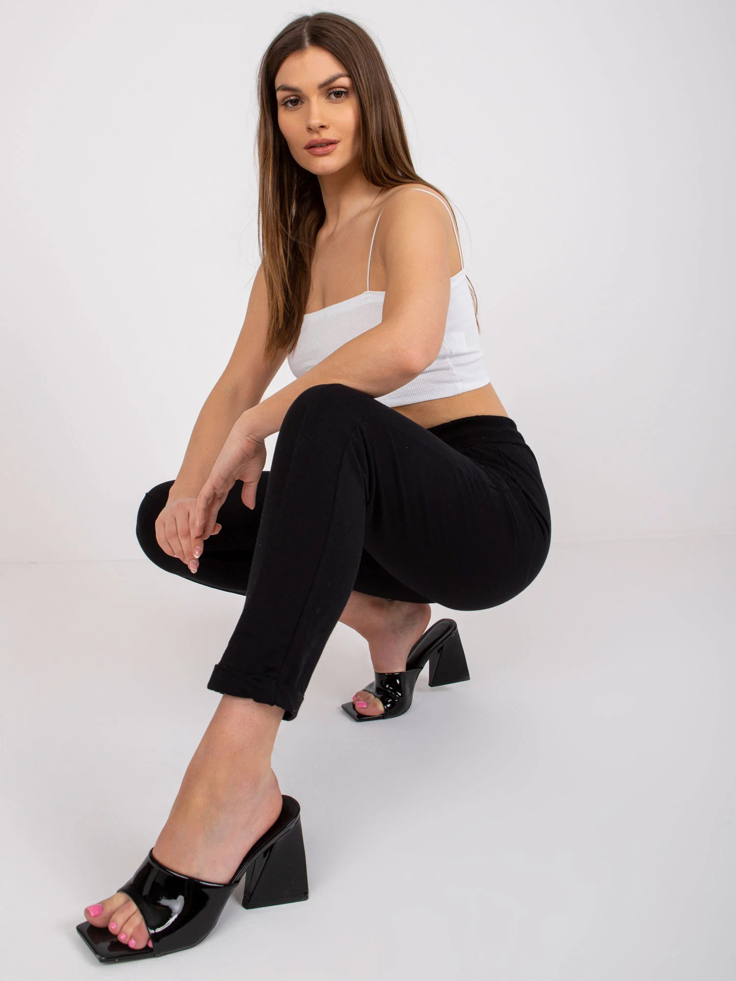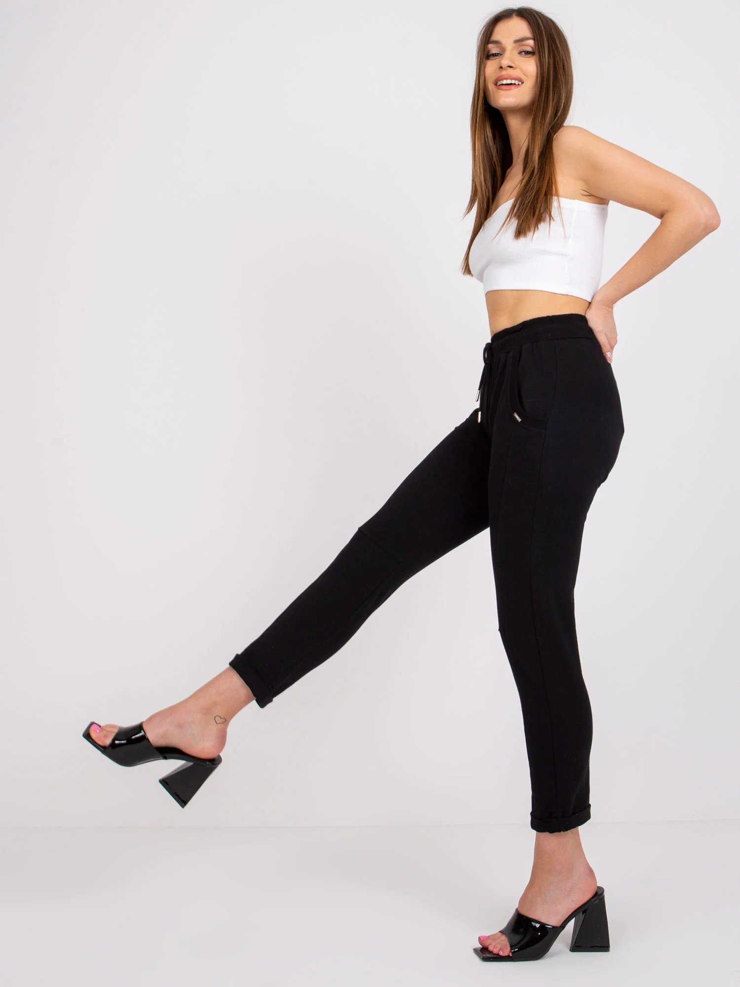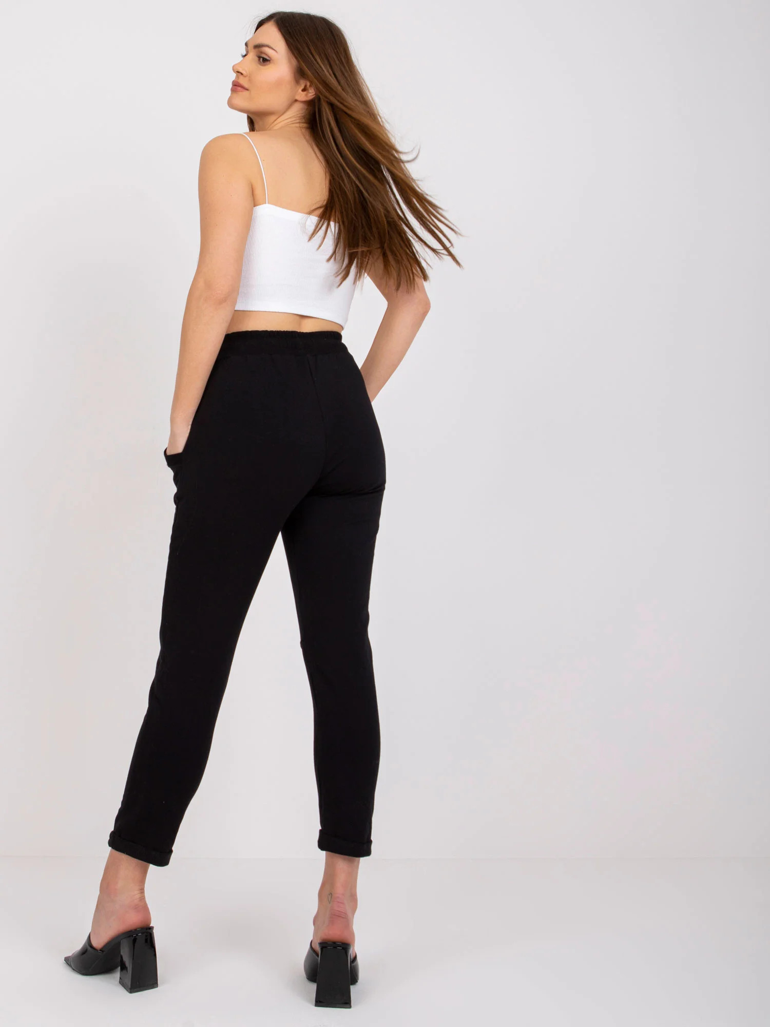 Rozměry kalhot velikosti S měřené na plocho: šířka v pase - 33 cm, délka kalhot - 86 cm, výška v pase - 26 cm.