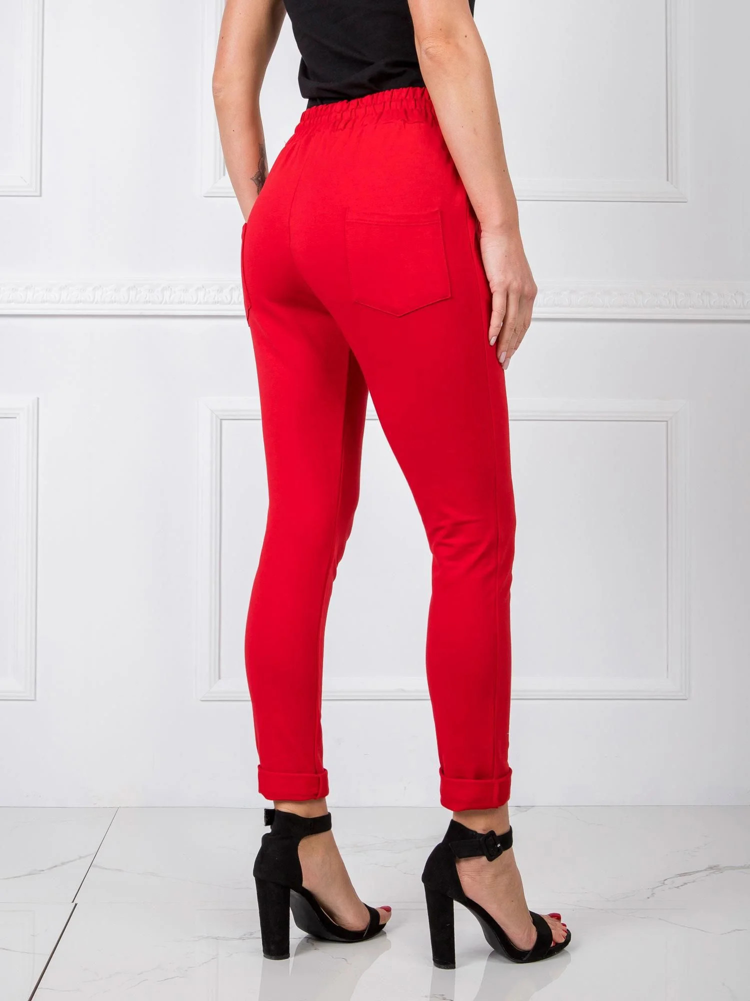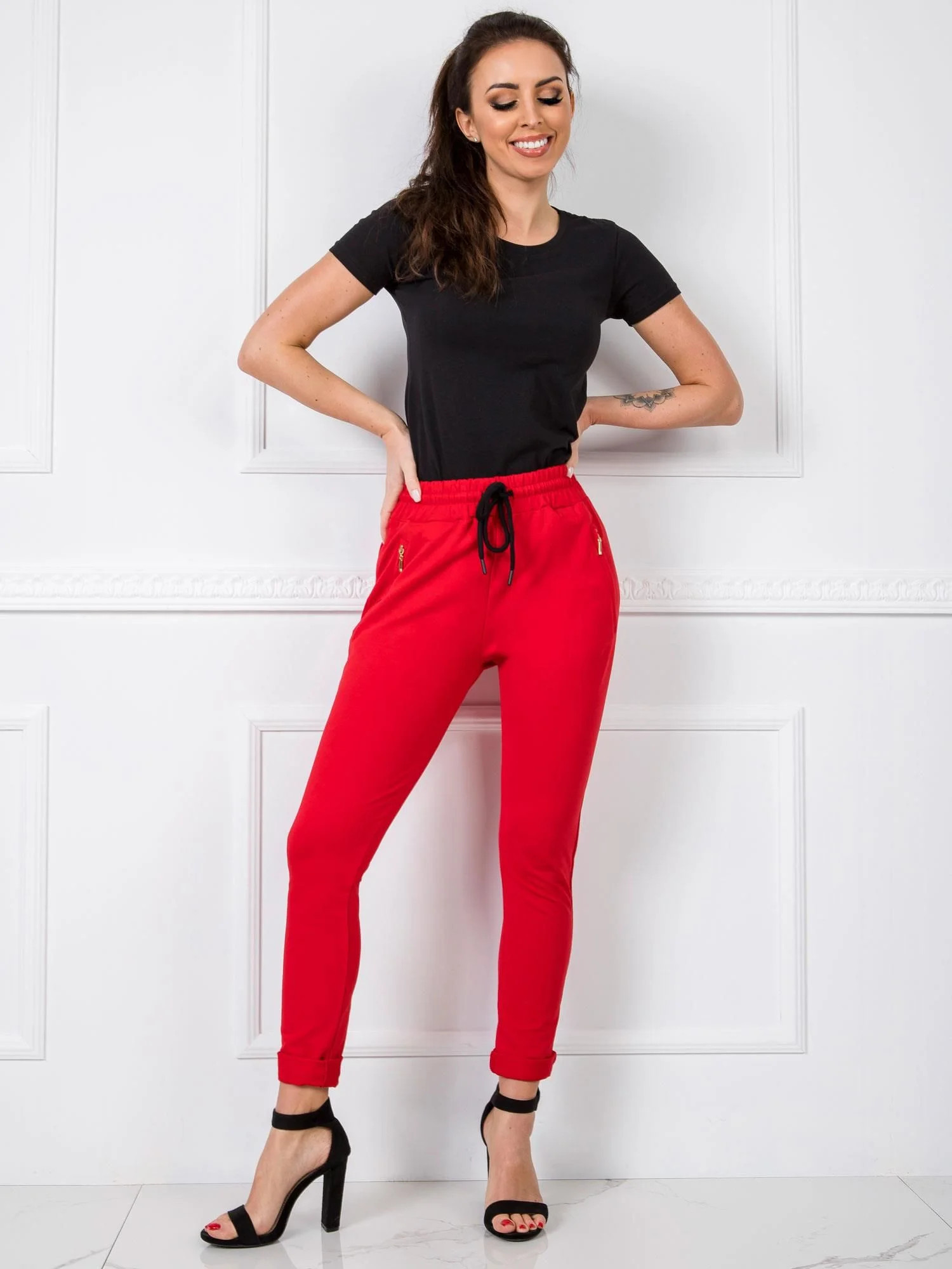 Dámské tepláky v červené barvě.