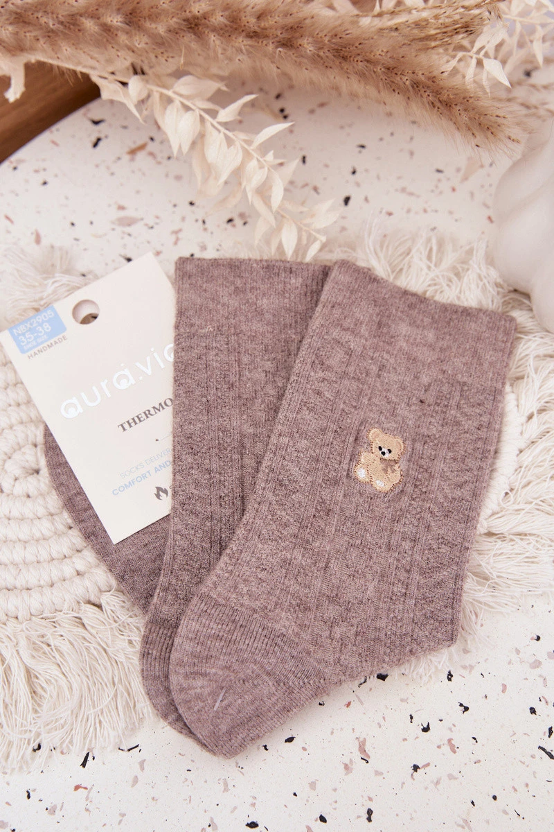 Hřejivé dámské ponožky v tmavě béžovém odstínu s roztomilým motivem medvídka. Vyrobené z měkké vlněné směsi, která poskytuje tepelný komfort, měkkost a pohodlí při nošení. Ideální volba pro zimní období a domácí pohodu.