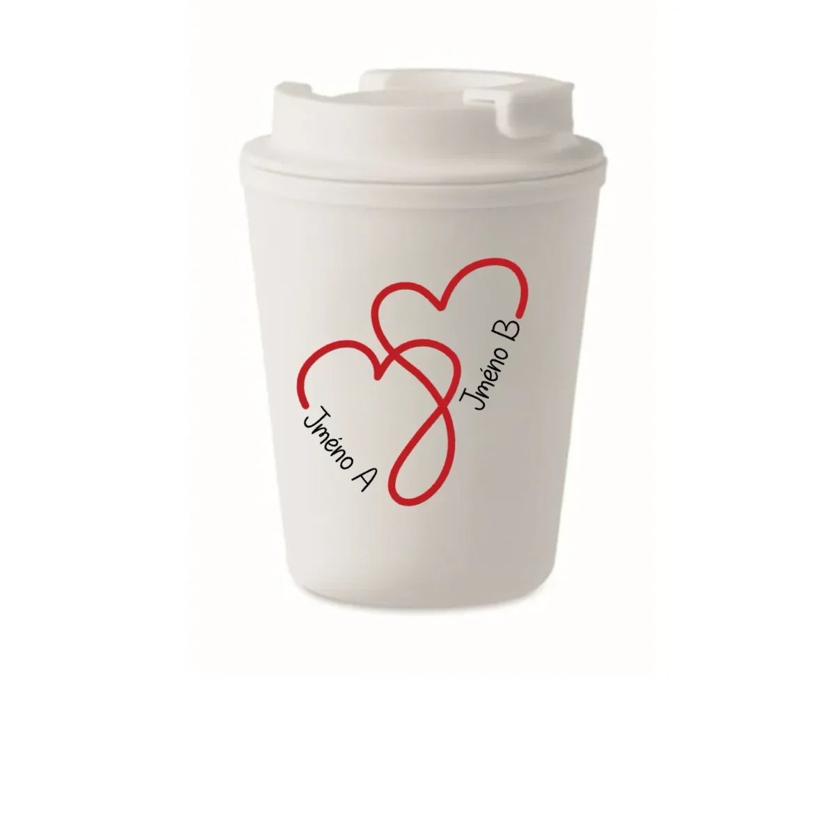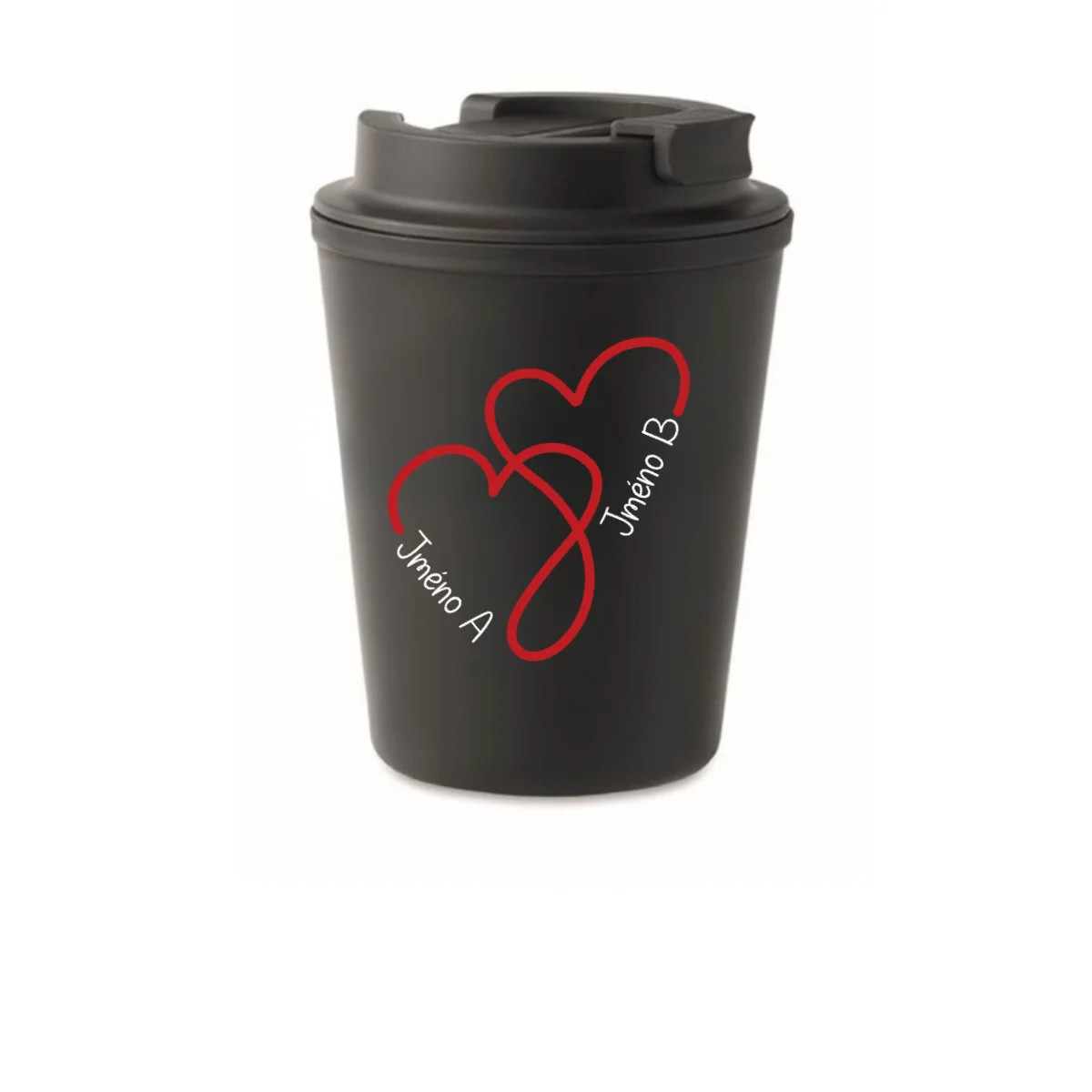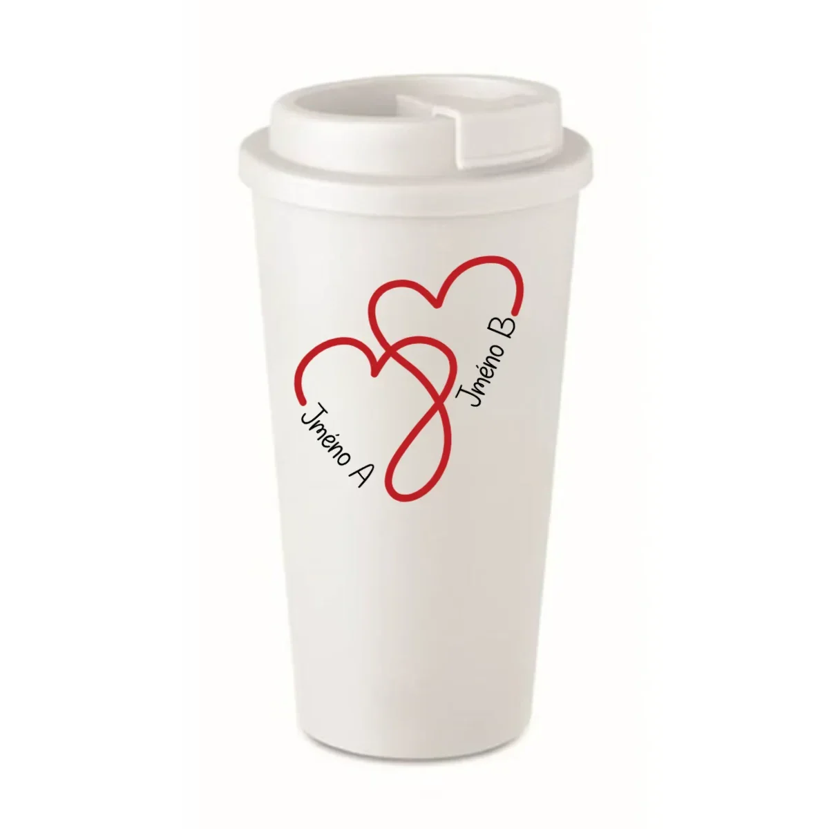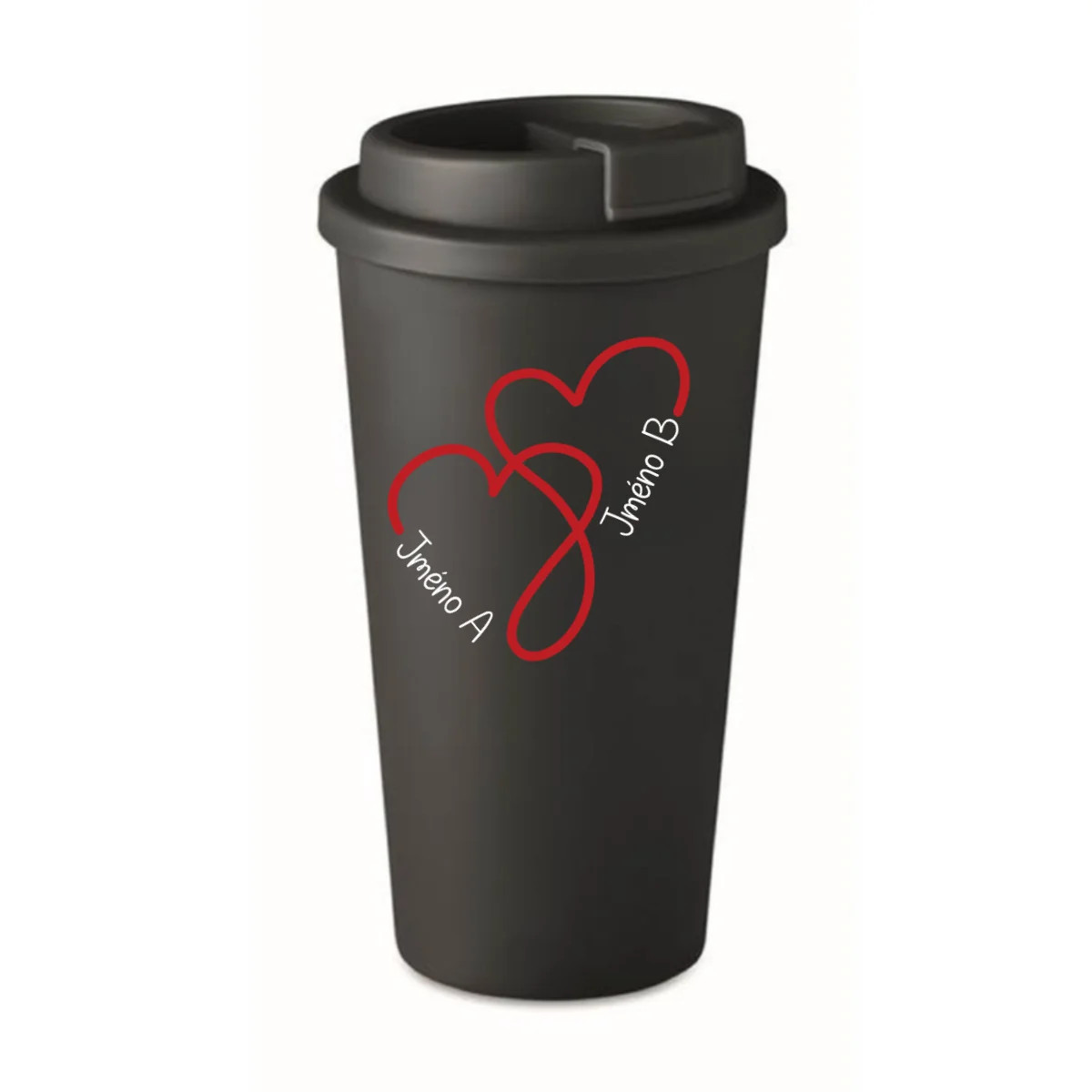 Hledáš dokonalý dárek pro svou drahou polovičku, kamarádku nebo třeba rodiče? Tento stylový cestovní hrnek s motivem dvou propletených srdcí a možnosti přidání vlastních jmen je víc než jen praktický – je osobní, láskyplný a jedinečný.