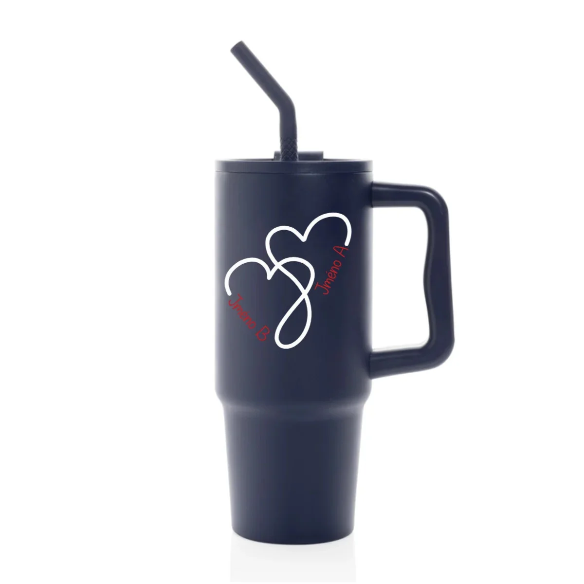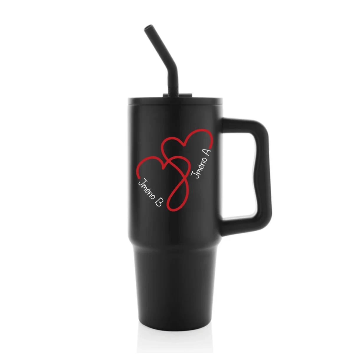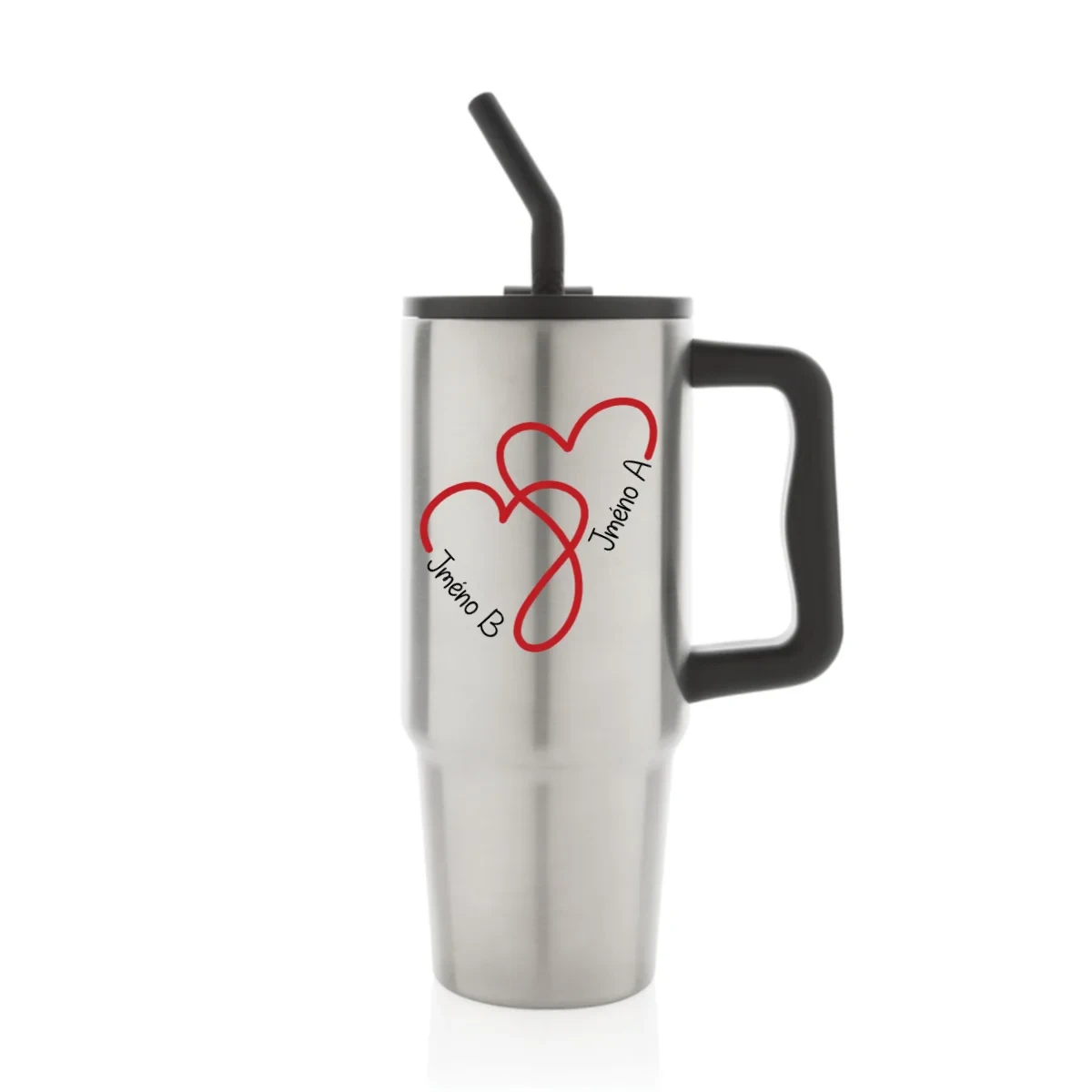 Láska v každém doušku. 💞 Originální velký cestovní termohrnek (900 ml) s motivem propletených srdcí, ke kterému si sami zvolíte dvě jména – ideální pro zamilované, novomanžele, kamarády nebo jako výjimečný dárek z lásky.