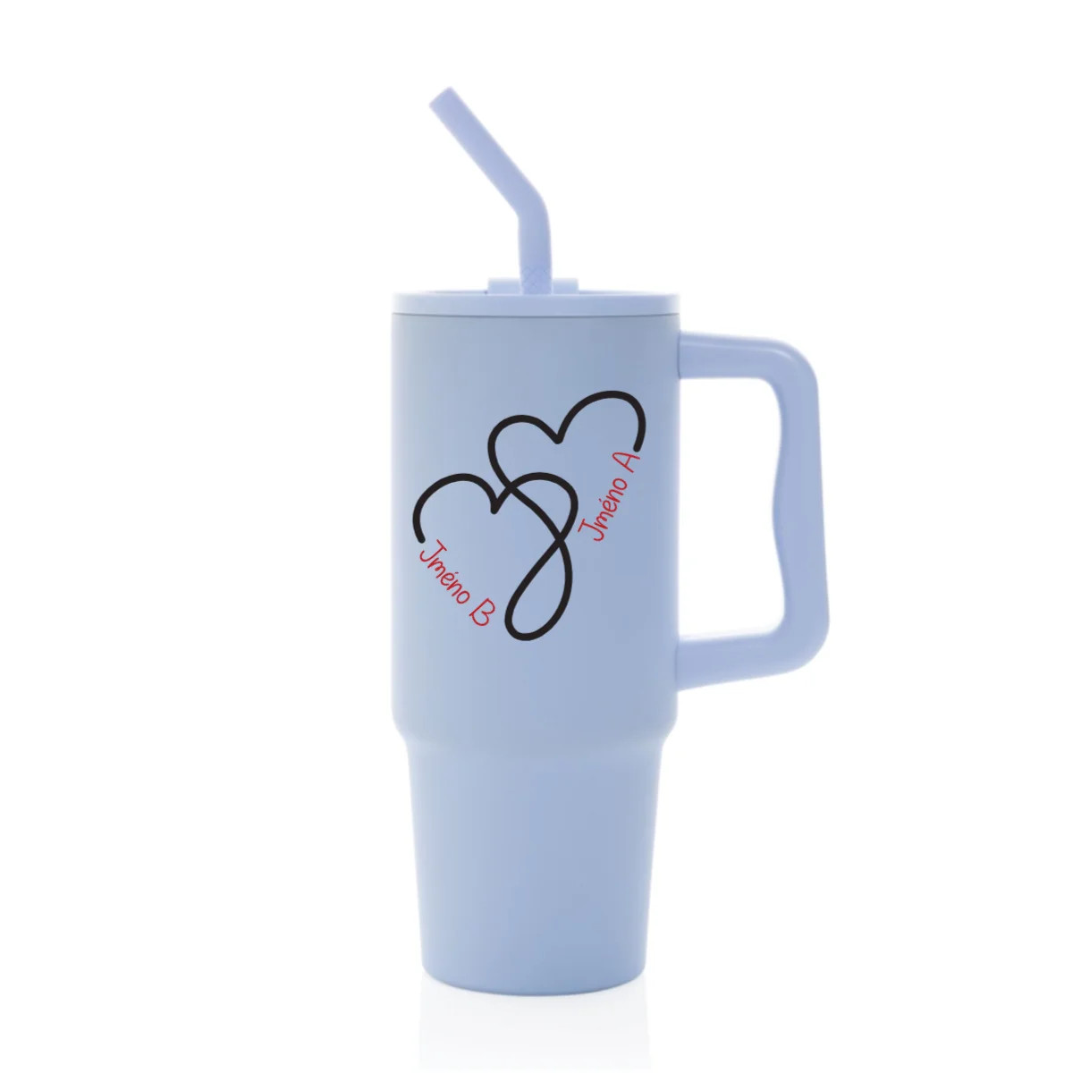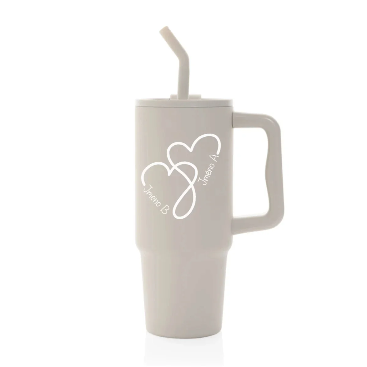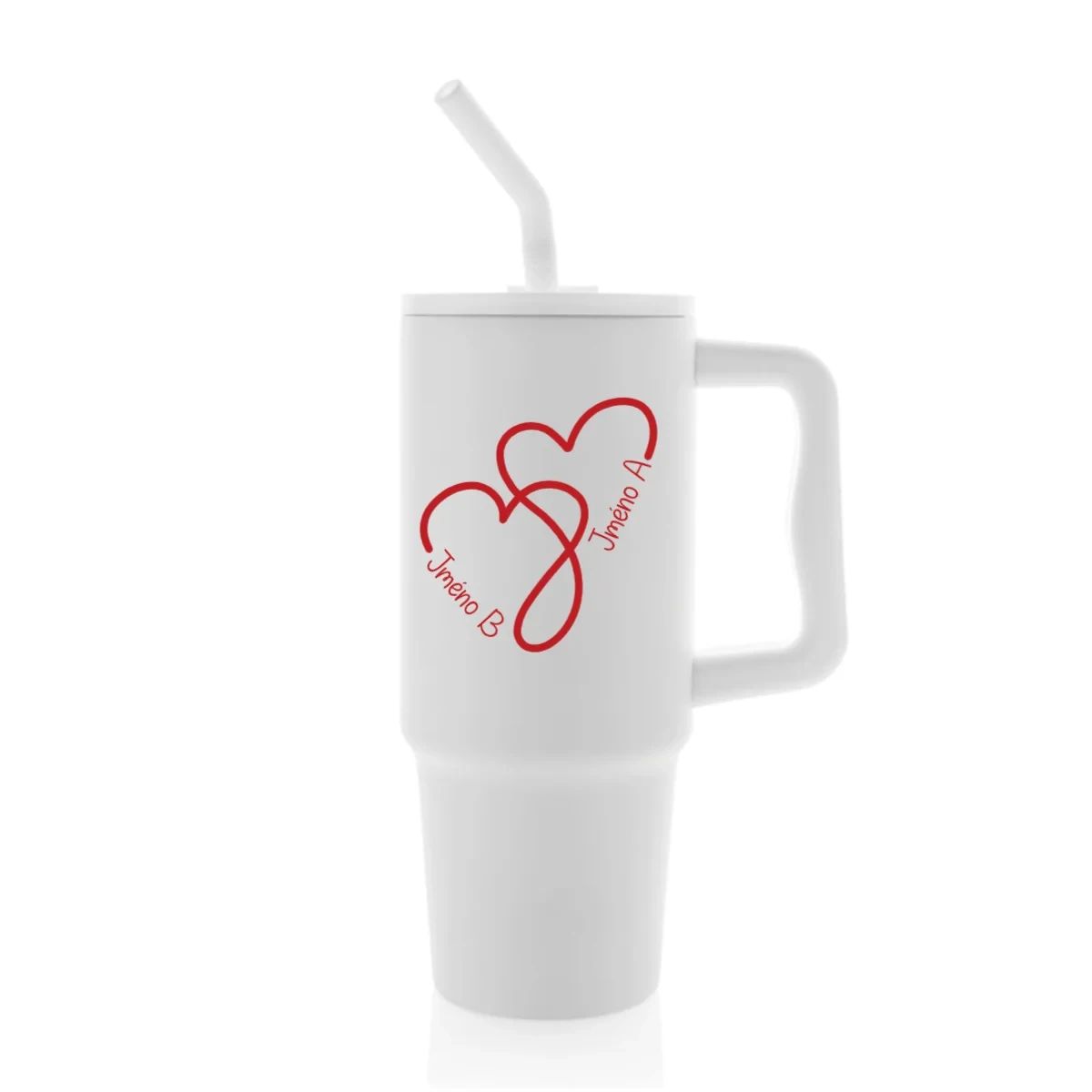 Láska v každém doušku. 💞 Originální velký cestovní termohrnek (900 ml) s motivem propletených srdcí, ke kterému si sami zvolíte dvě jména – ideální pro zamilované, novomanžele, kamarády nebo jako výjimečný dárek z lásky.