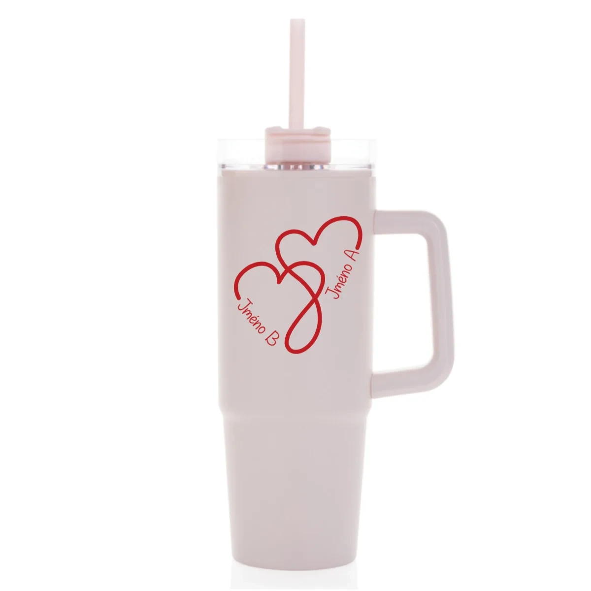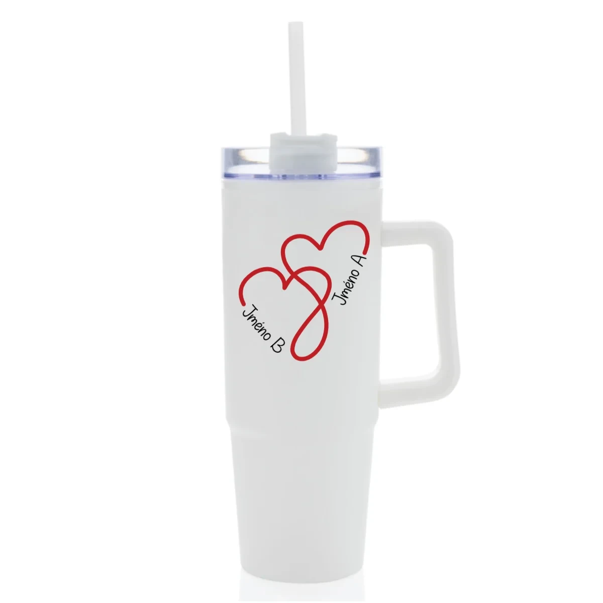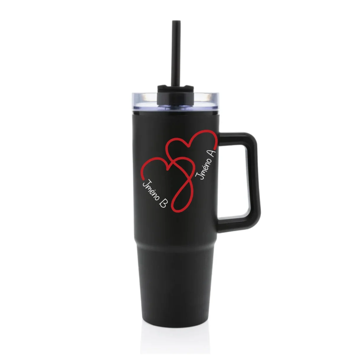 Láska v každém doušku. 💞 Originální velký cestovní termohrnek (900 ml) s motivem propletených srdcí, ke kterému si sami zvolíte dvě jména – ideální pro zamilované, novomanžele, kamarády nebo jako výjimečný dárek z lásky.