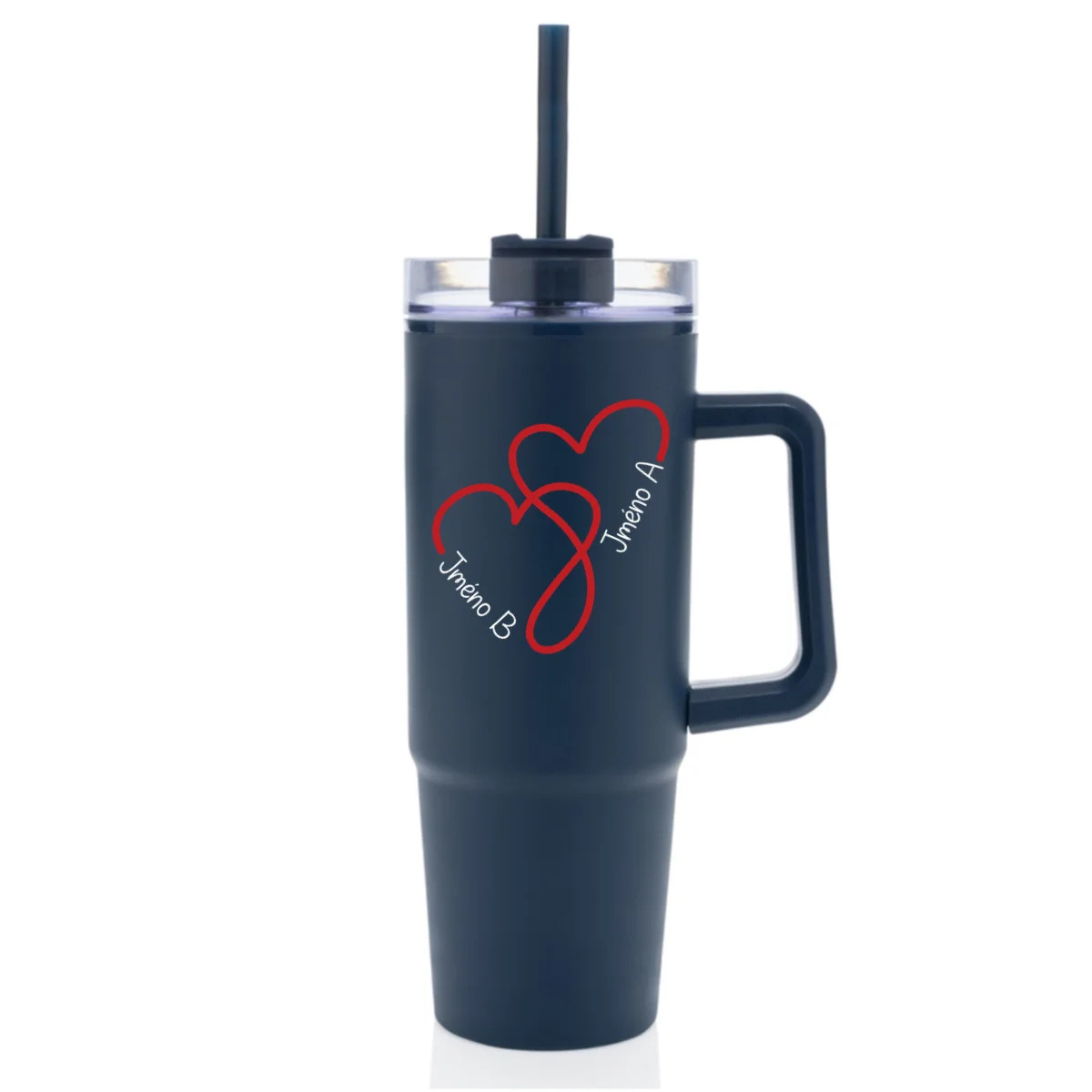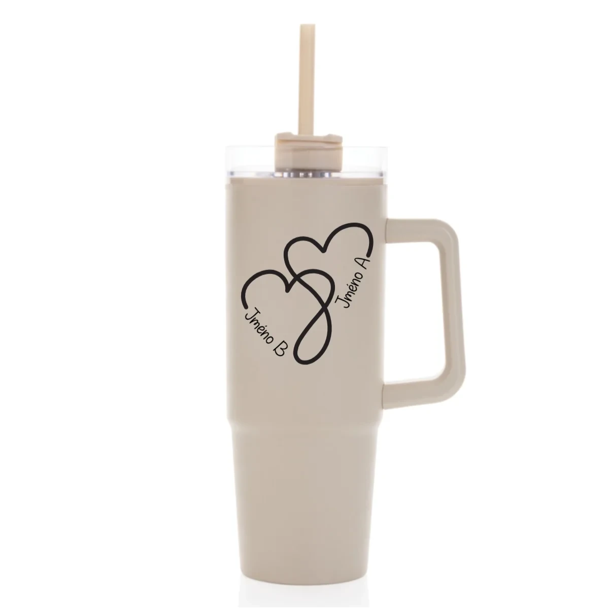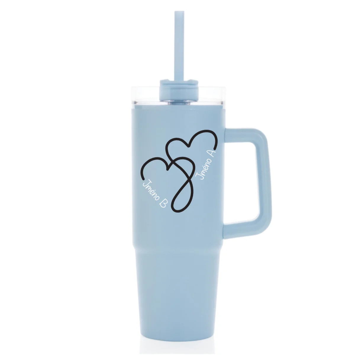 Láska v každém doušku. 💞 Originální velký cestovní termohrnek (900 ml) s motivem propletených srdcí, ke kterému si sami zvolíte dvě jména – ideální pro zamilované, novomanžele, kamarády nebo jako výjimečný dárek z lásky.