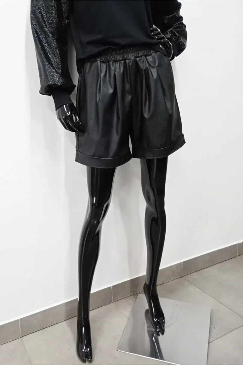 Dámské šortky z ekoóry. Mají elastický pas. Nohavice jsou zakončeny manžetou, která je další ozdobou šortek. Ideální na schůzky, večírky i na nadcházející svátky
