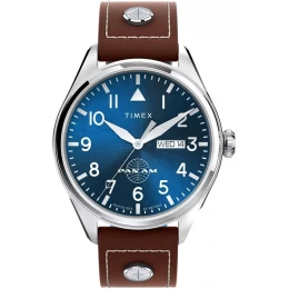 Model TIMEX Waterbuty kombinuje klasickou estetiku leteckých hodinek s 42mm pouzdrem z nerezové oceli - jedním z nejrozpoznatelnějších v nabídce značky. modré prvky hodinek, jako je námořnicky modrý ciferník, vnitřní modrý řemínek a precizní detaily, jsou záměrným odkazem na vizuální identitu letecké společnosti Pan Am, která silně odkazuje na estetiku 60. a 70. let, kdy Pan Am zažívala svá zlatá léta. modely z této série se vyznačují vintage designem a robustní konstrukcí, využívající nerezovou ocel, kožený řemínek a minerální sklíčko. každé hodinky z kolekce a precizní detailyTimexx Pan Am® jsou dodávány v jedinečné sběratelské krabičce inspirované autentickými nálepkami na zavazadla a se sběratelským špendlíkem této letecké společnosti.