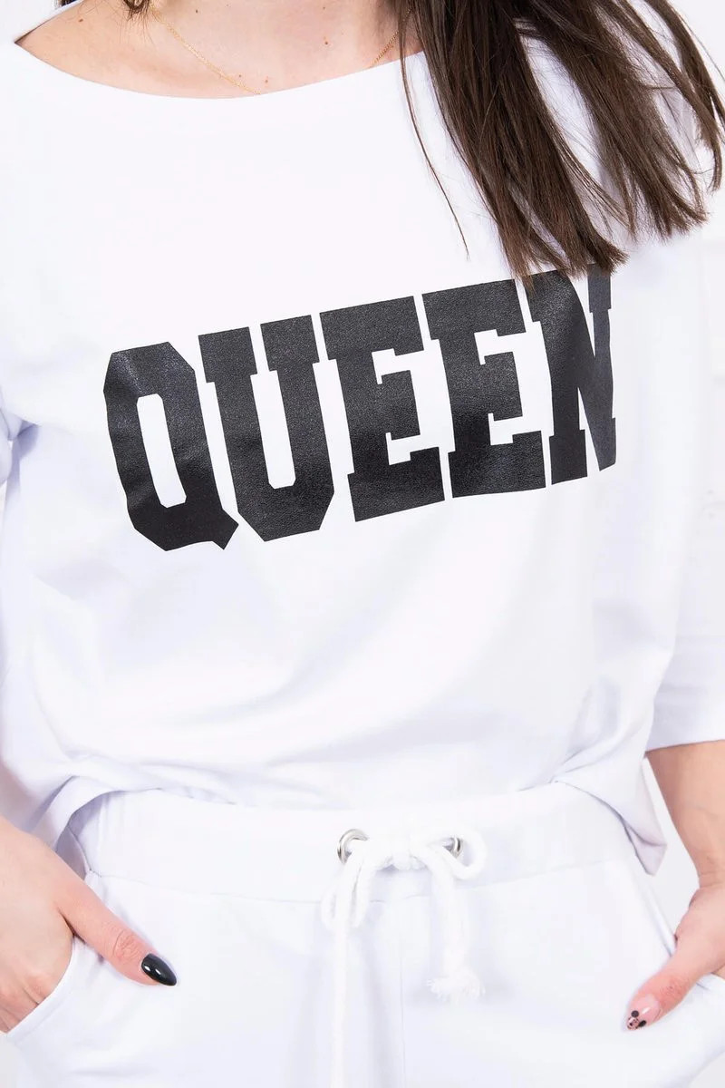 Představujeme vám sadu halenky a kalhot. Oversize halenka s potiskem Queen. Kalhoty s kapsami a zavazováním v pase. Sada je vyrobena z vysoce kvalitního materiálu. Velikost je univerzální a vyhovuje dámám velikosti S, M nebo L.