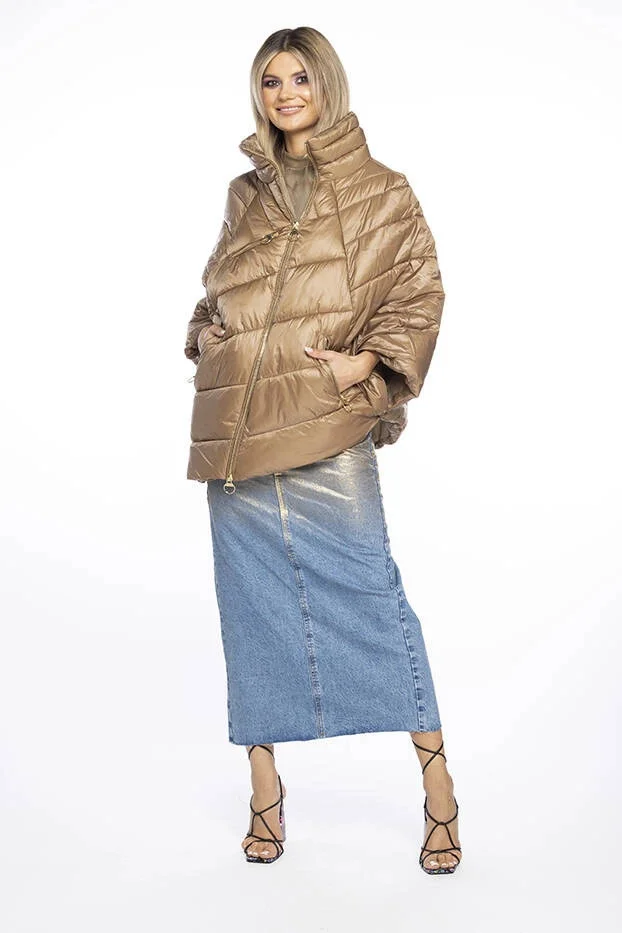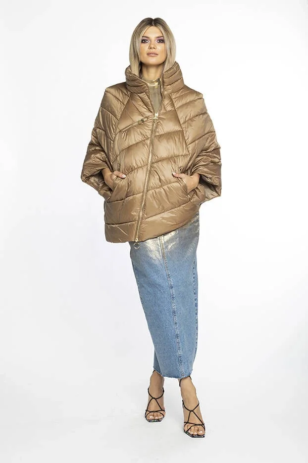 Tmavě béžová dámská bunda pončo s ozdobnými zipy model 19035476 - Ann Gissy
