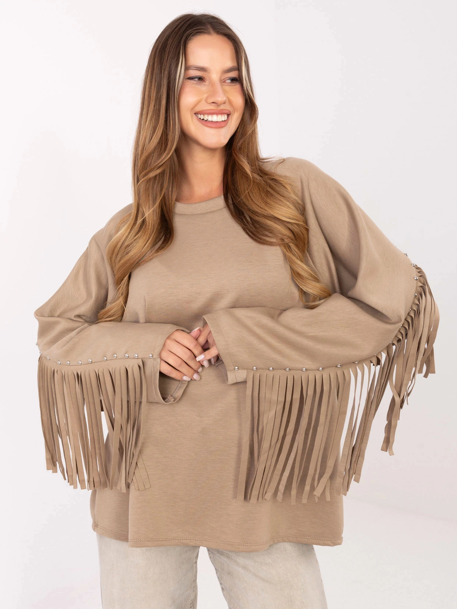 Přidání recenze k Tmavě béžová volná dámská mikina s třásněmi (21695)