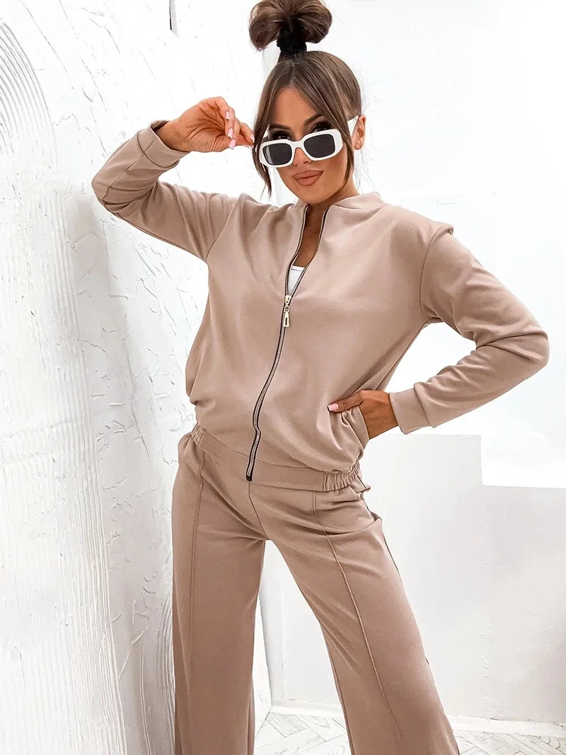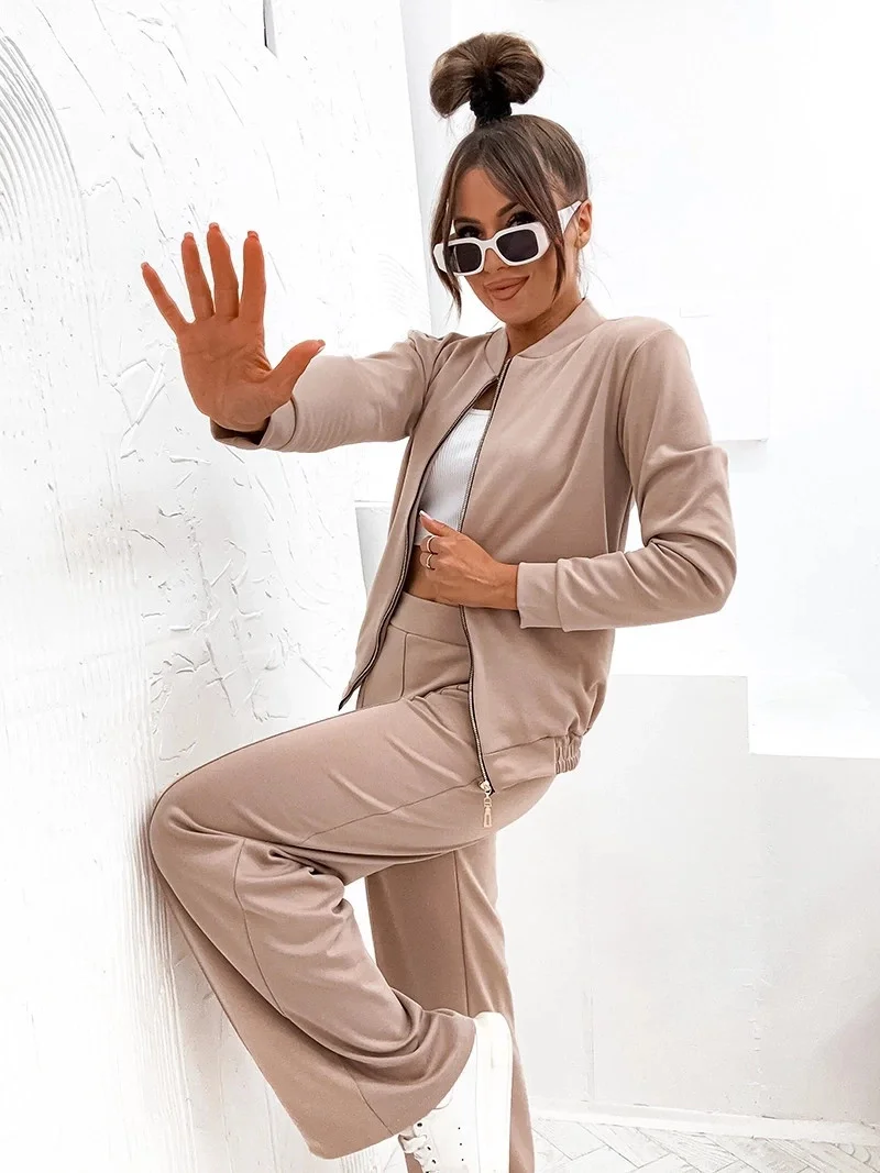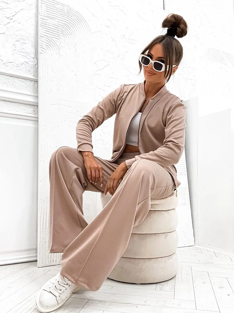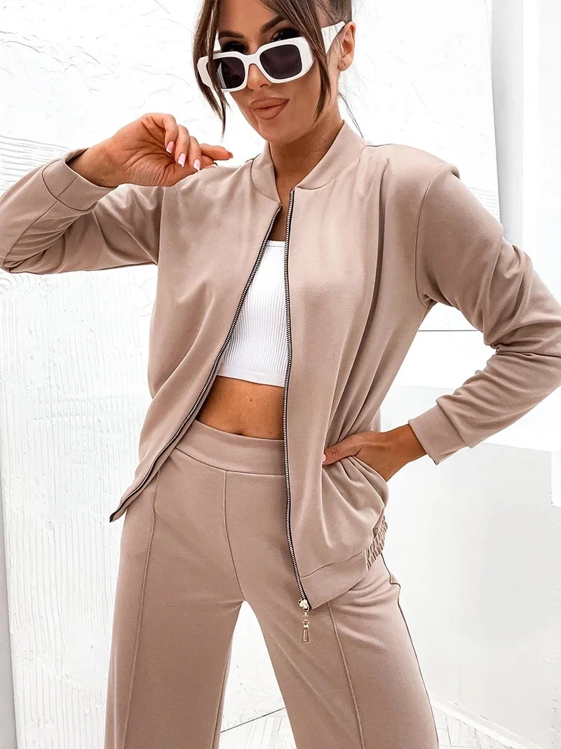 Tmavě béžový dámský komplet - mikina bomberka a široké kalhoty (82105)