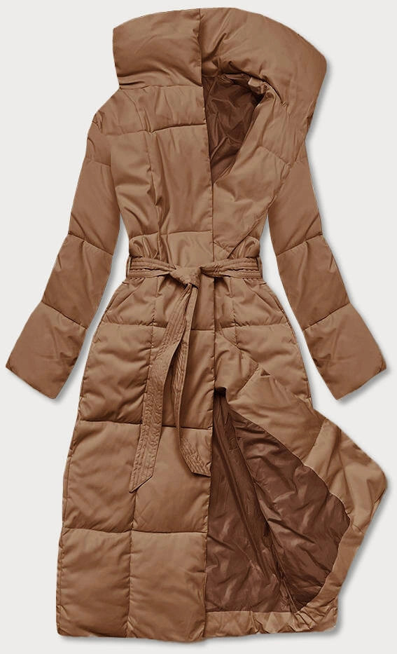 Tmavě béžový dámský zimní kabát s páskem (2M-061)