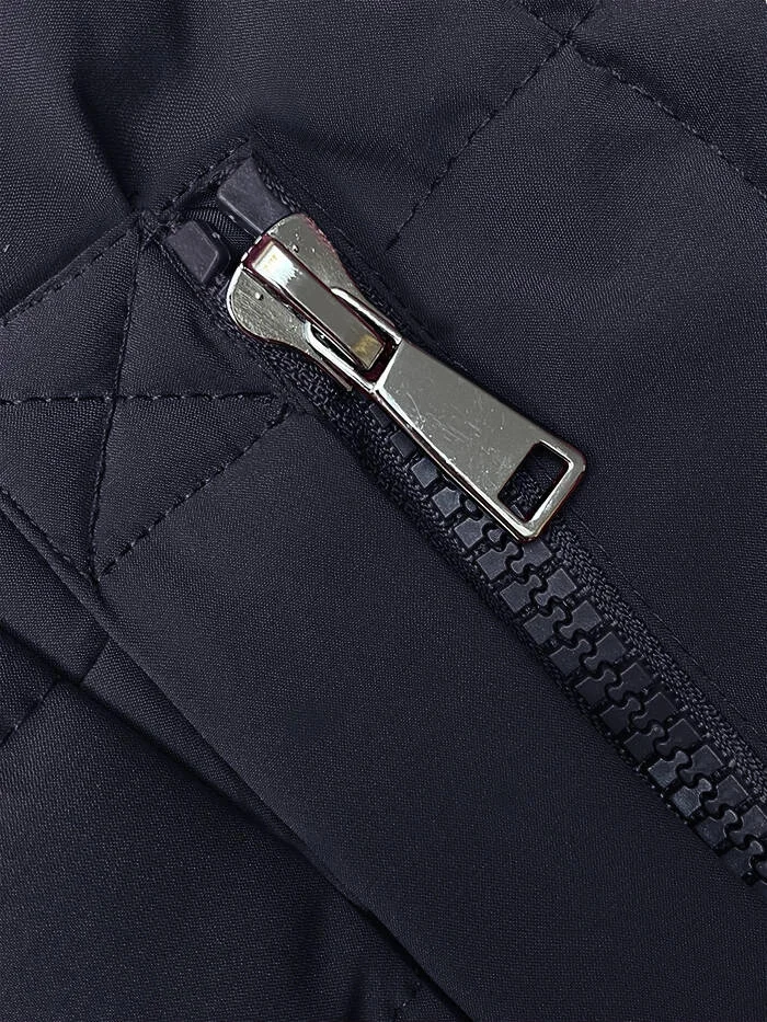 Vesta má jednoduchý střih, má dvě kapsy a zapíná se zipem. Model má kapuci, kterou je možné odepnout. Vesta má délku do poloviny stehen.