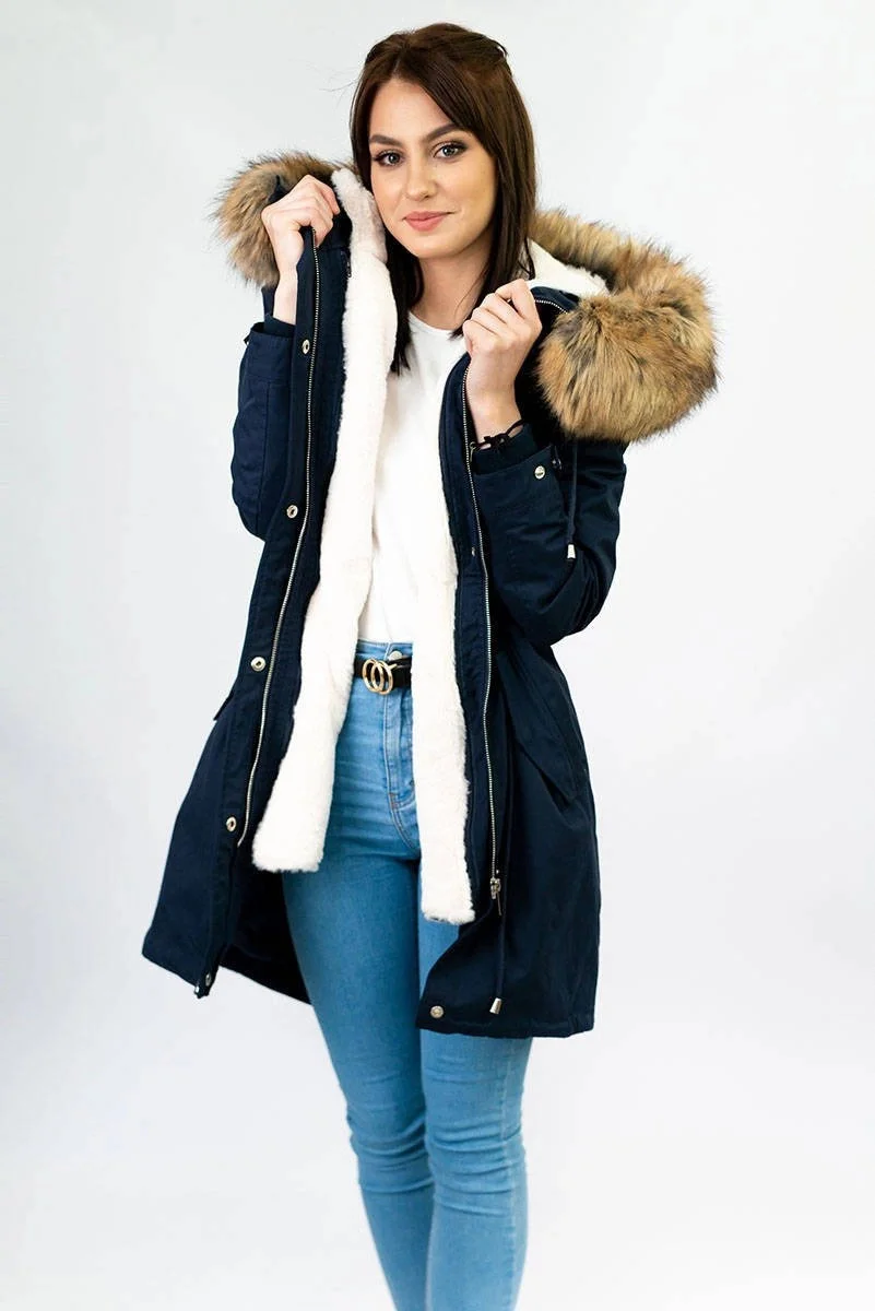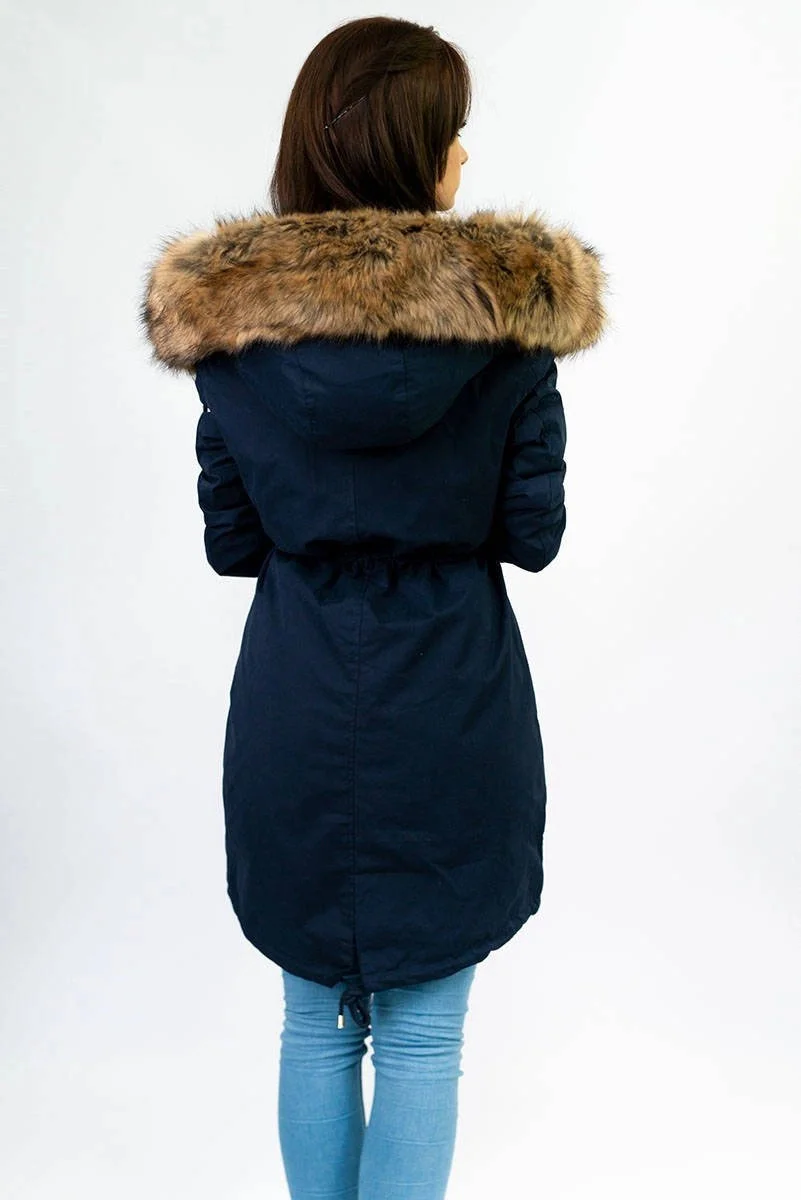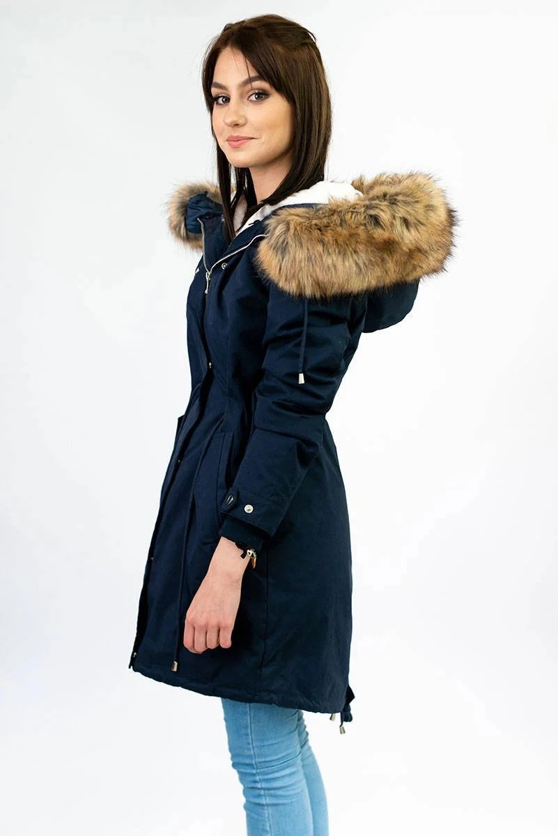 Tmavě modrá dámská zimní bunda parka s kapucí a odepínací kožešinovou podšívkou model 21242084 - Libland