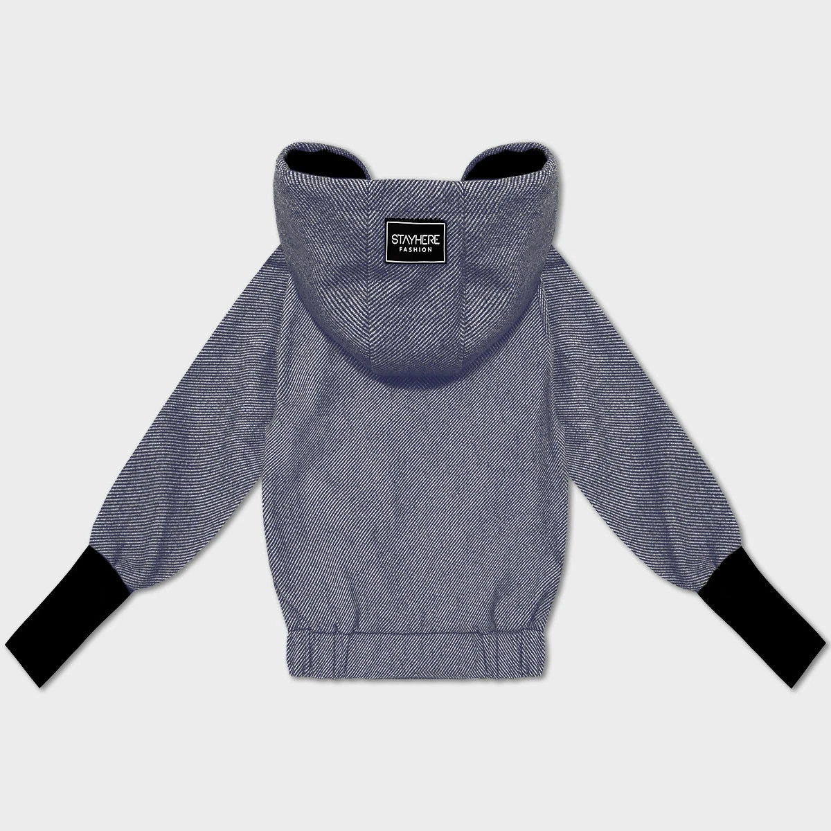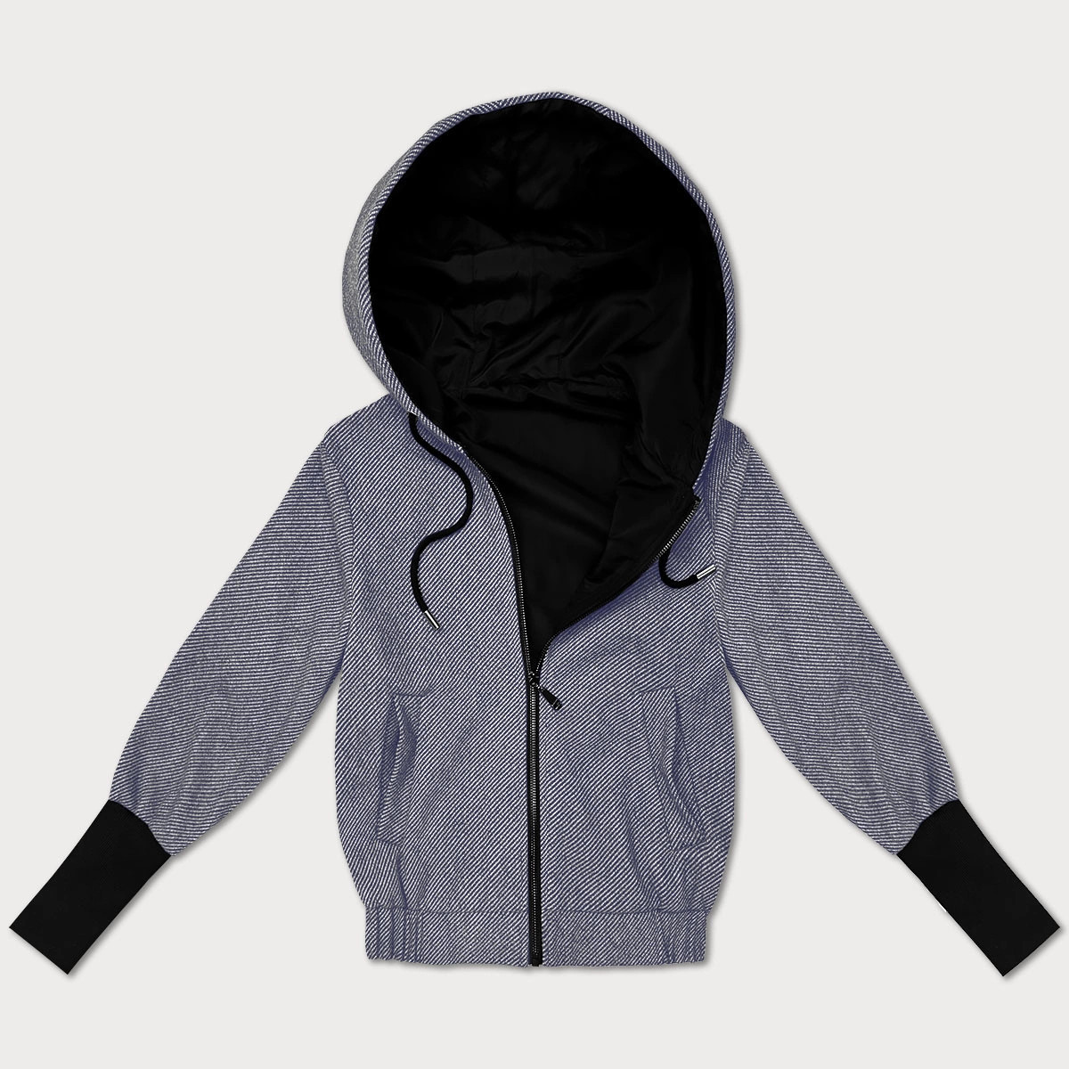 Bunda má volný střih, má podšívku, dvě kapsy bez zapínání a zapíná se zipem. Model má kapuci, kterou není možné odepnout. Rukávy jsou olemované úpletovými stahovacími lemy. Bunda má délku k bokům.