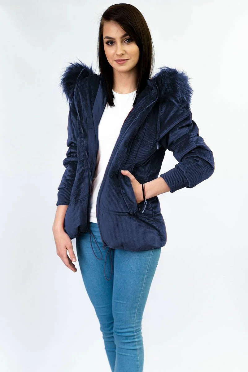 Tmavě modrá manšestrová dámská bunda s kapucí (7696)