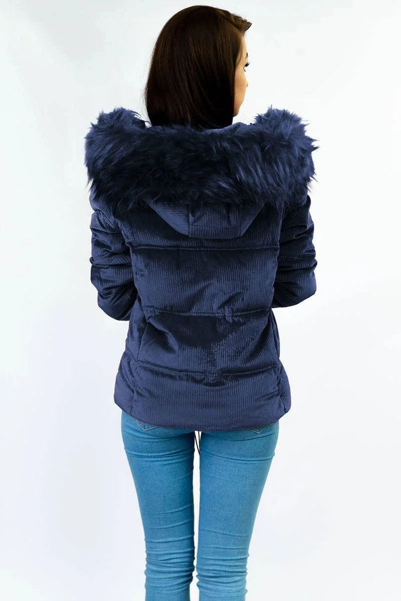 Přidání recenze k Tmavě modrá manšestrová dámská bunda s kapucí (7696)