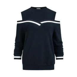 Pohodlná tmavě modrá dámská blůza s odhalenými rameny, která je olemovaná módními stahovacími lemy v bílo-tmavě modré barvě.