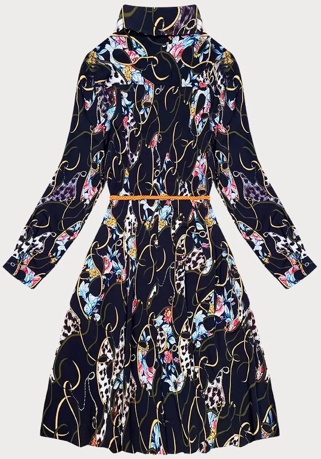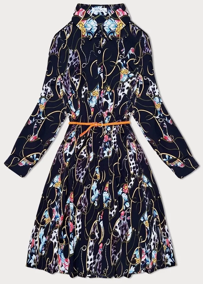 Tmavě modré dámské květované plisované šaty s límečkem (Z-56)