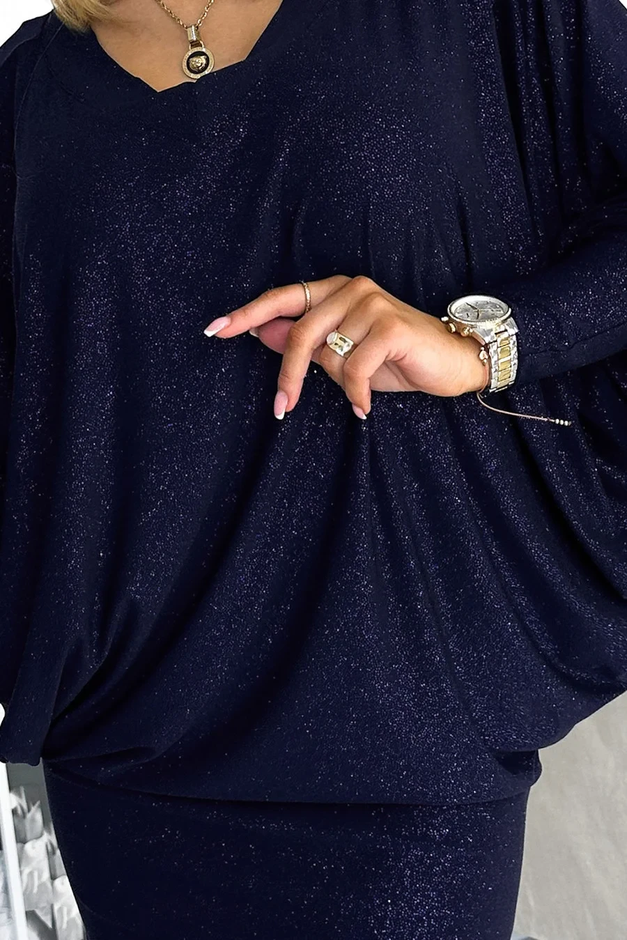 Přidání recenze k Tmavě modré dámské netopýří šaty s brokátem a s výstřihem 402-1