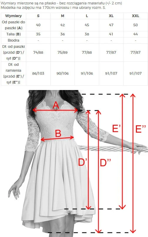 Modelka na fotografii je vysoká 170 cm a předvádí šaty ve velikosti S.