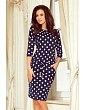 Tyto šaty značky Numoco jsou polským výrobkem a jsou k dostání ve tmavě modré barvě s bílými puntíky. Model je vyrobený z pružného materiálu příjemného na dotyk.
