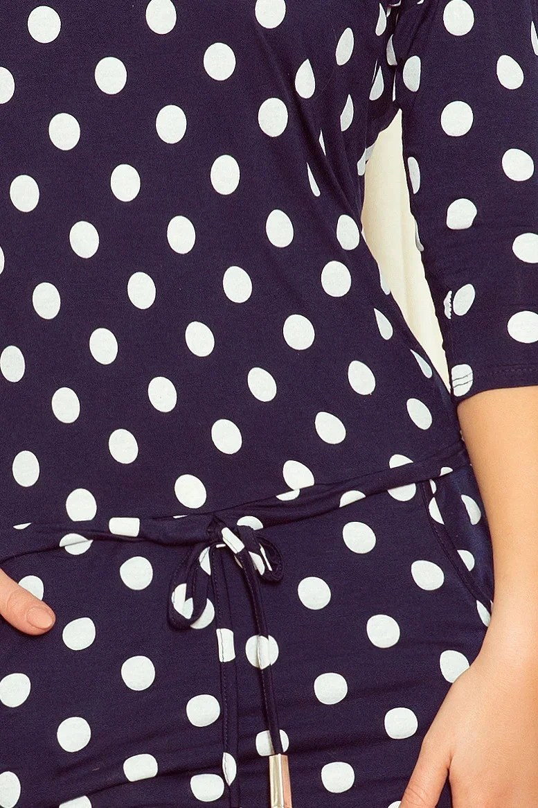 Tyto šaty značky Numoco jsou polským výrobkem a jsou k dostání ve tmavě modré barvě s bílými puntíky. Model je vyrobený z pružného materiálu příjemného na dotyk.