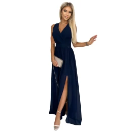 Tmavě modré dlouhé dámské šaty s výstřihem a zavazováním model 18409728 - numoco