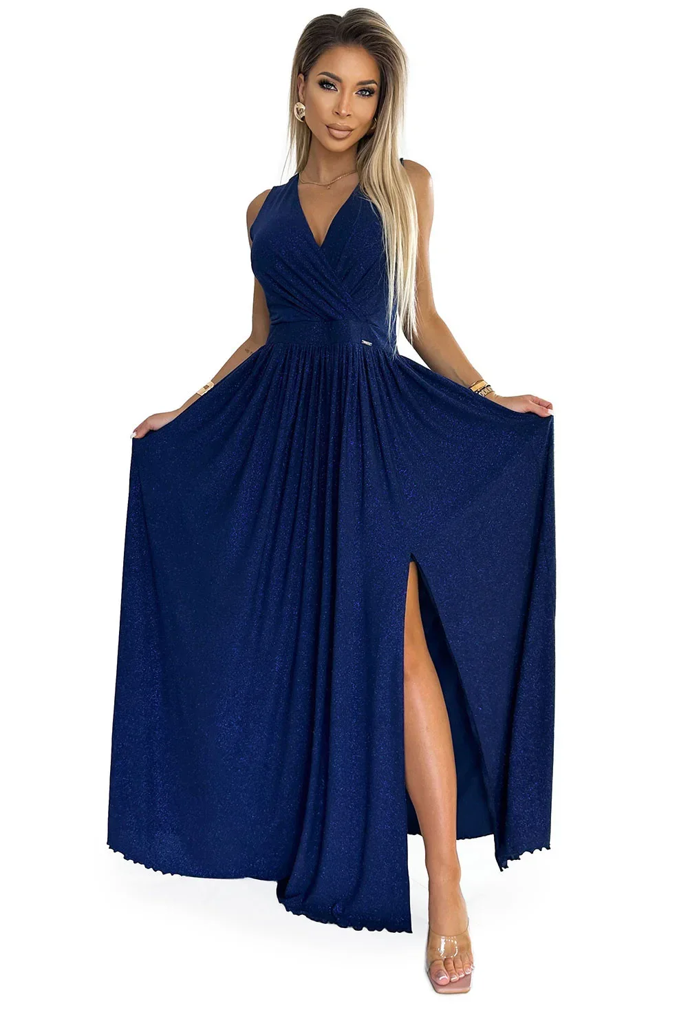 Šaty jsou ušité z pružného materiálu v tmavě modré barvě s brokátem. Model se zapíná vzadu skrytým zipem. Tyto šaty značky Numoco jsou polským výrobkem.