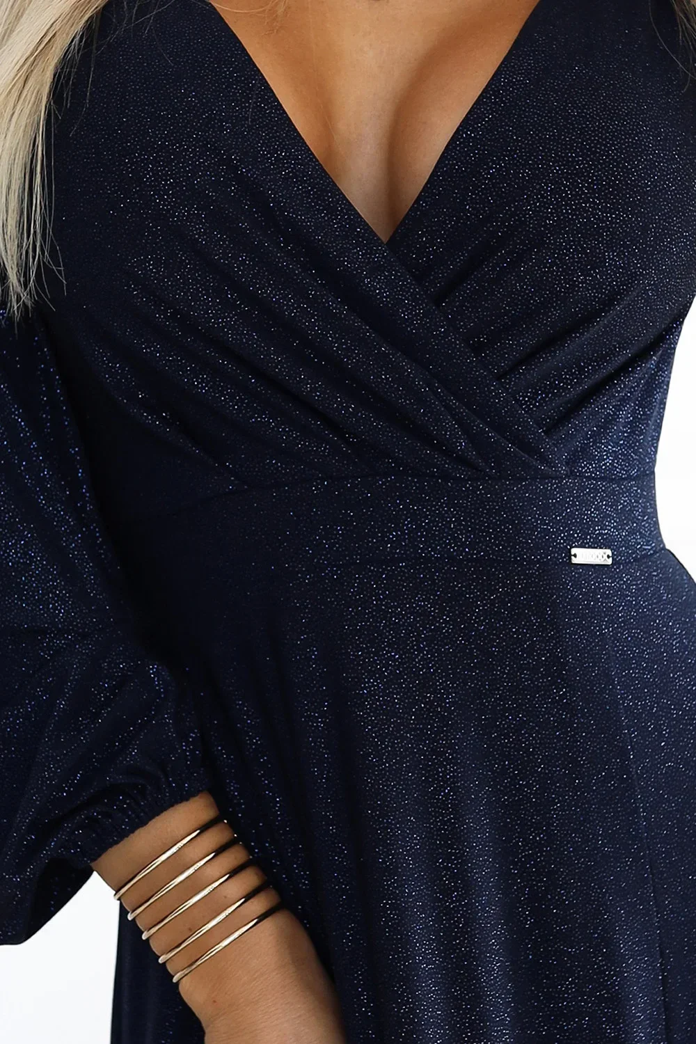Tmavě modré lesklé dlouhé dámské šaty s výstřihem a dlouhými rukávy model 20614736 - numoco